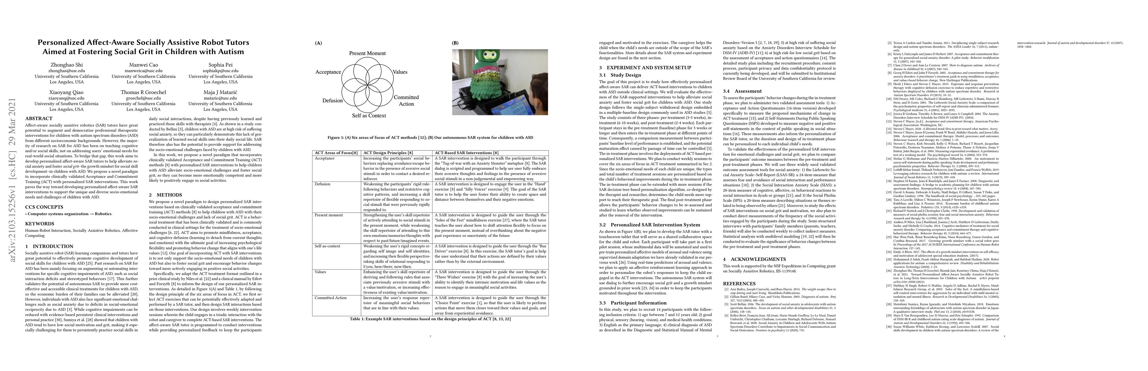 This research develops personalized affect-aware socially assistive robot tutors to alleviate social anxiety and foster social grit in children with autism spectrum disorders. The study integrates Acceptance and Commitment Training with tailored interventions, aiming to address the emotional needs of children with ASD.