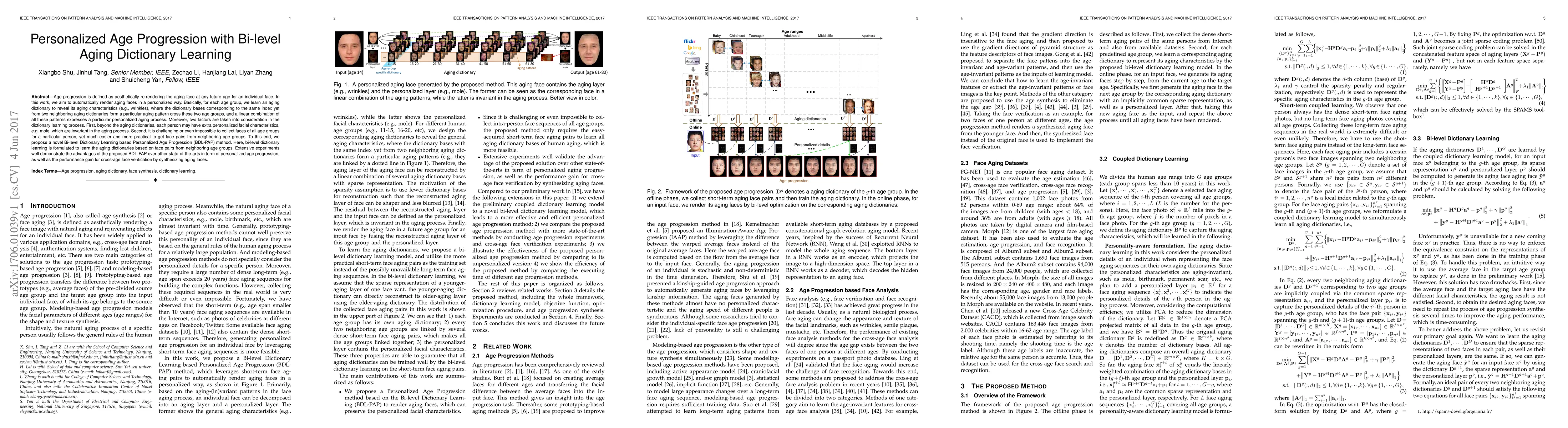 This paper proposes a Bi-level Dictionary Learning based Personalized Age Progression (BDL-PAP) method to render aging faces in a personalized manner by learning aging dictionaries for each age group and considering invariant personal characteristics. The method effectively synthesizes aging faces using face pairs from neighboring age groups, demonstrating superior performance over other methods.