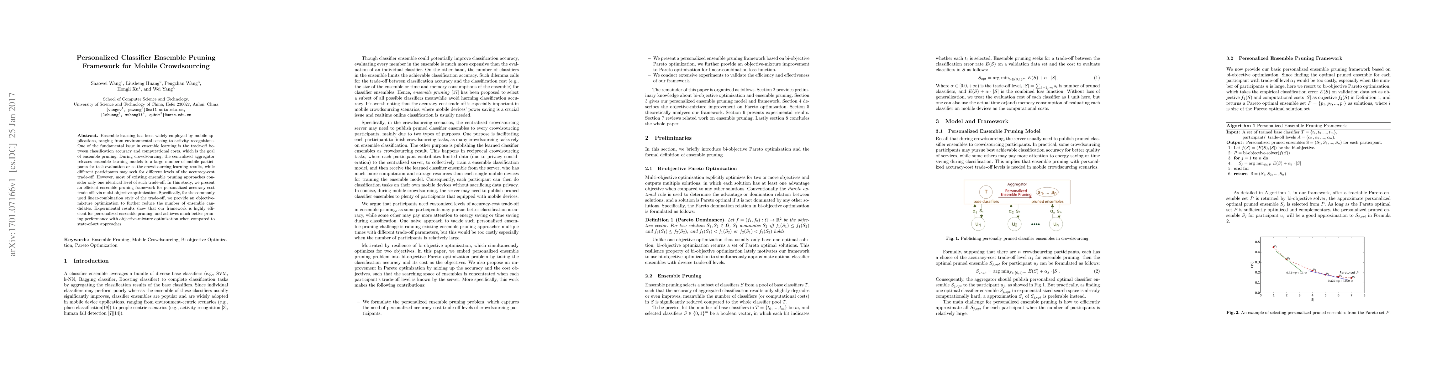 The paper introduces a personalized classifier ensemble pruning framework for mobile crowdsourcing, addressing the accuracy-cost trade-off issue. It proposes an efficient multi-objective optimization method, called objective-mixture optimization, to cater to varying participant requirements. Experiments demonstrate the framework's effectiveness in achieving better pruning performance compared to existing approaches.