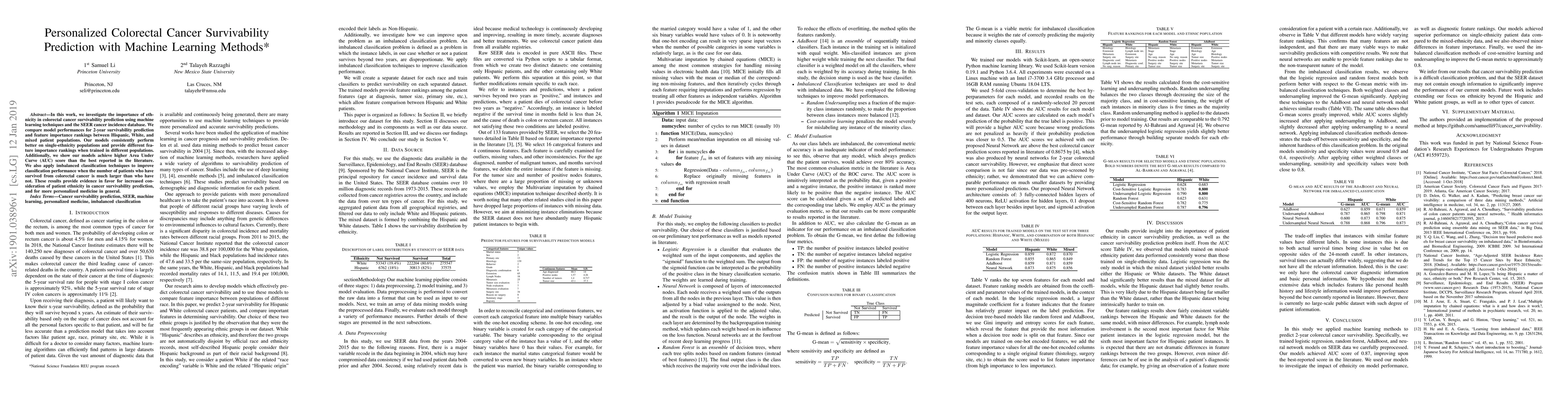 In this work, we investigate the importance of ethnicity in colorectal cancer survivability prediction using machine learning techniques and the SEER cancer incidence database. We compare model performances for 2-year survivability prediction and feature importance rankings between Hispanic, White, and mixed patient populations. Our models consistently perform better on single-ethnicity populations and provide different feature importance rankings when trained in different populations. Additionally, we show our models achieve higher Area Under Curve (AUC) score than the best reported in the literature. We also apply imbalanced classification techniques to improve classification performance when the number of patients who have survived from colorectal cancer is much larger than who have not. These results provide evidence in favor for increased consideration of patient ethnicity in cancer survivability prediction, and for more personalized medicine in general.
