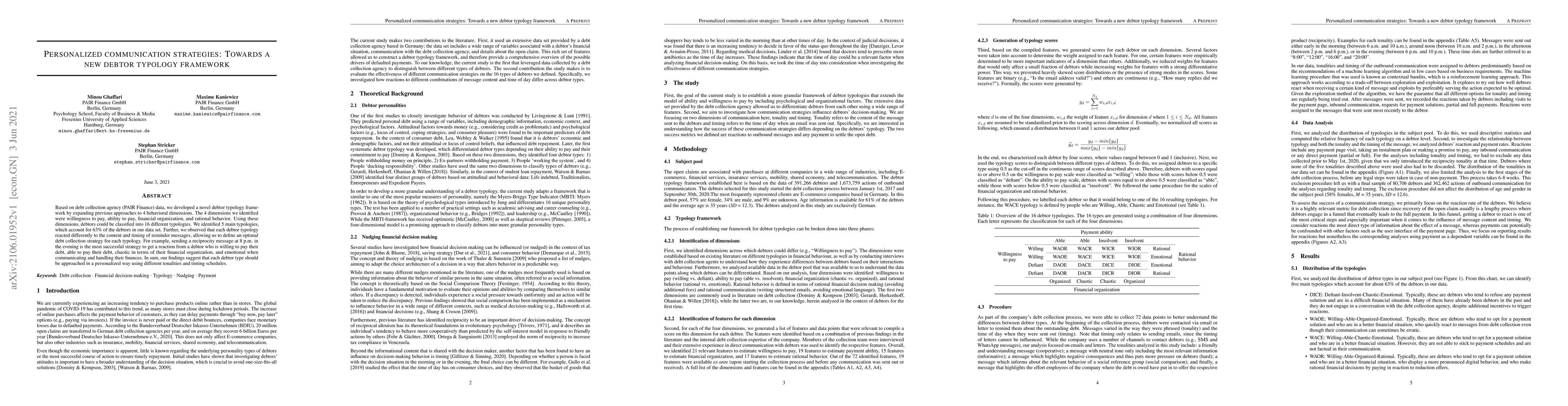 Based on debt collection agency (PAIR Finance) data, we developed a novel debtor typology framework by expanding previous approaches to 4 behavioral dimensions. The 4 dimensions we identified were willingness to pay, ability to pay, financial organization, and rational behavior. Using these dimensions, debtors could be classified into 16 different typologies. We identified 5 main typologies, which account for 63% of the debtors in our data set. Further, we observed that each debtor typology reacted differently to the content and timing of reminder messages, allowing us to define an optimal debt collection strategy for each typology. For example, sending a reciprocity message at 8 p.m. in the evening is the most successful strategy to get a reaction from a debtor who is willing to pay their debt, able to pay their debt, chaotic in terms of their financial organization, and emotional when communicating and handling their finances. In sum, our findings suggest that each debtor type should be approached in a personalized way using different tonalities and timing schedules.