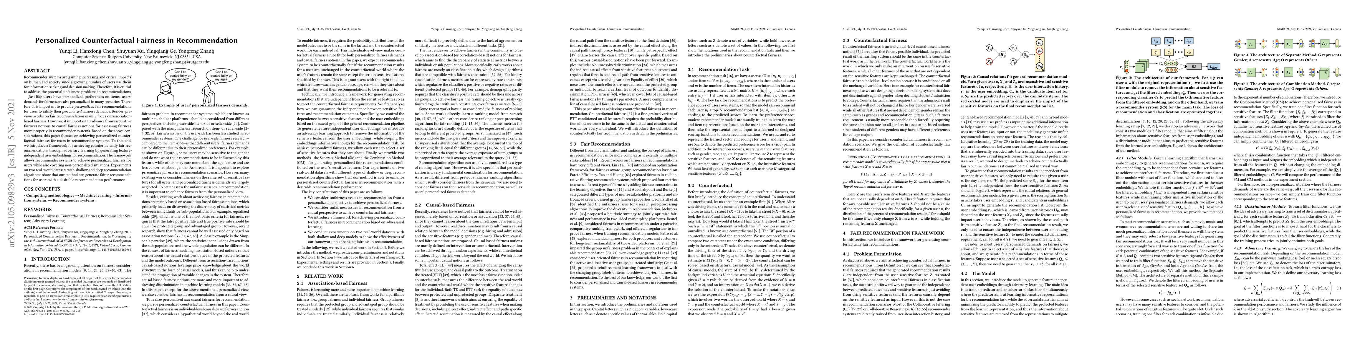 This paper introduces a framework for achieving personalized counterfactual fairness in recommender systems by generating feature-independent user embeddings through adversary learning. The proposed method aims to provide fairer recommendations tailored to users' personalized fairness demands while maintaining desirable recommendation performance.