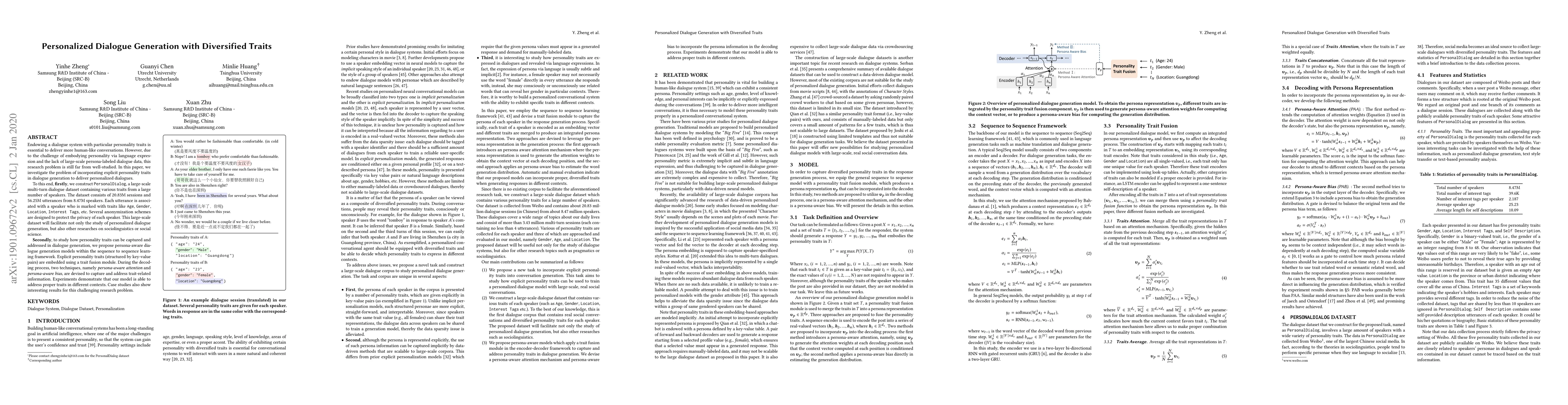 This paper constructs a large-scale dataset, PersonalDialog, to study personalized dialogue generation with diverse speaker traits. It also proposes persona-aware dialogue generation models that embed explicit personality traits and utilize persona-aware attention and bias to generate context-appropriate responses.