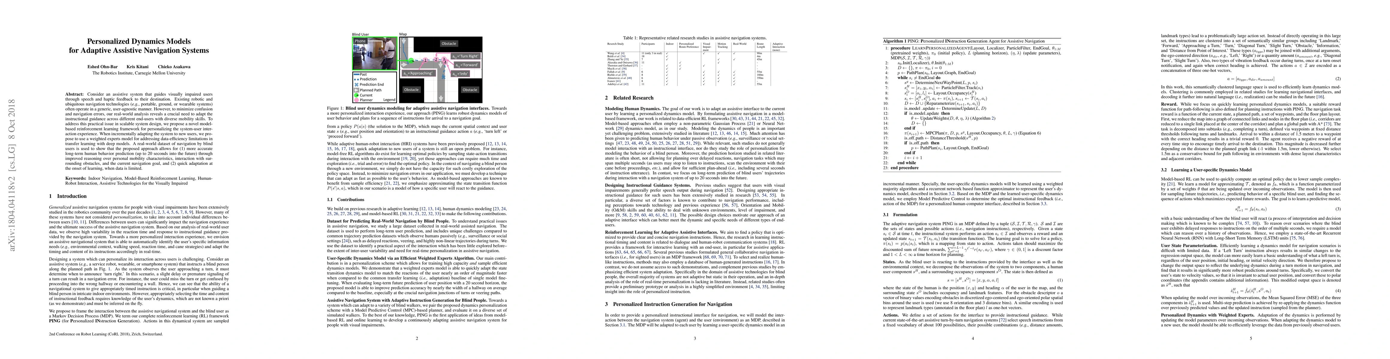 Consider an assistive system that guides visually impaired users through speech and haptic feedback to their destination. Existing robotic and ubiquitous navigation technologies (e.g., portable, ground, or wearable systems) often operate in a generic, user-agnostic manner. However, to minimize confusion and navigation errors, our real-world analysis reveals a crucial need to adapt the instructional guidance across different end-users with diverse mobility skills. To address this practical issue in scalable system design, we propose a novel model-based reinforcement learning framework for personalizing the system-user interaction experience. When incrementally adapting the system to new users, we propose to use a weighted experts model for addressing data-efficiency limitations in transfer learning with deep models. A real-world dataset of navigation by blind users is used to show that the proposed approach allows for (1) more accurate long-term human behavior prediction (up to 20 seconds into the future) through improved reasoning over personal mobility characteristics, interaction with surrounding obstacles, and the current navigation goal, and (2) quick adaptation at the onset of learning, when data is limited.