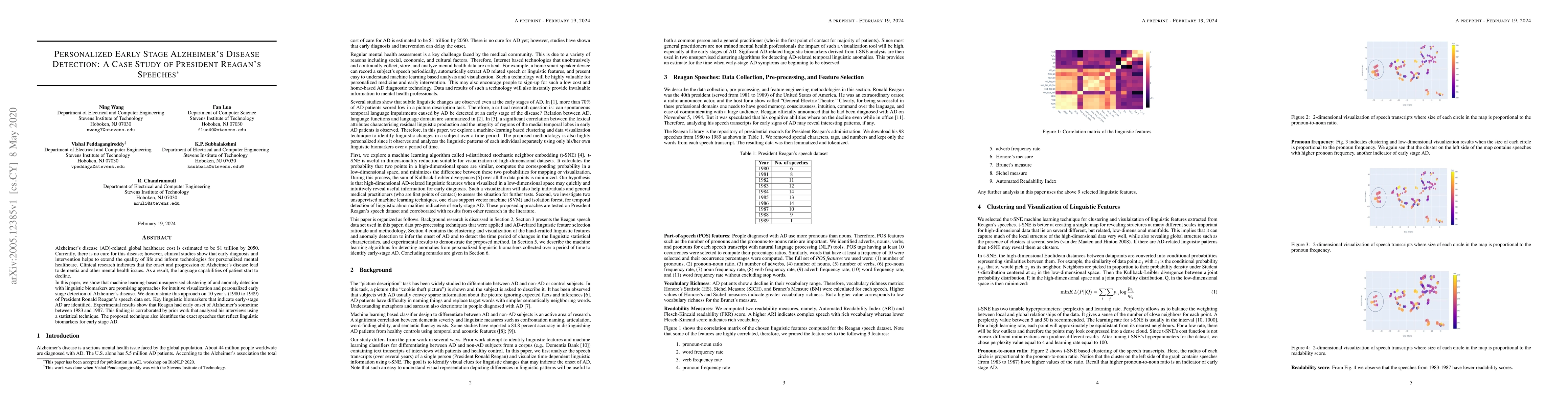 Alzheimer`s disease (AD)-related global healthcare cost is estimated to be $1 trillion by 2050. Currently, there is no cure for this disease; however, clinical studies show that early diagnosis and intervention helps to extend the quality of life and inform technologies for personalized mental healthcare. Clinical research indicates that the onset and progression of Alzheimer`s disease lead to dementia and other mental health issues. As a result, the language capabilities of patient start to decline. In this paper, we show that machine learning-based unsupervised clustering of and anomaly detection with linguistic biomarkers are promising approaches for intuitive visualization and personalized early stage detection of Alzheimer`s disease. We demonstrate this approach on 10 year`s (1980 to 1989) of President Ronald Reagan`s speech data set. Key linguistic biomarkers that indicate early-stage AD are identified. Experimental results show that Reagan had early onset of Alzheimer`s sometime between 1983 and 1987. This finding is corroborated by prior work that analyzed his interviews using a statistical technique. The proposed technique also identifies the exact speeches that reflect linguistic biomarkers for early stage AD.