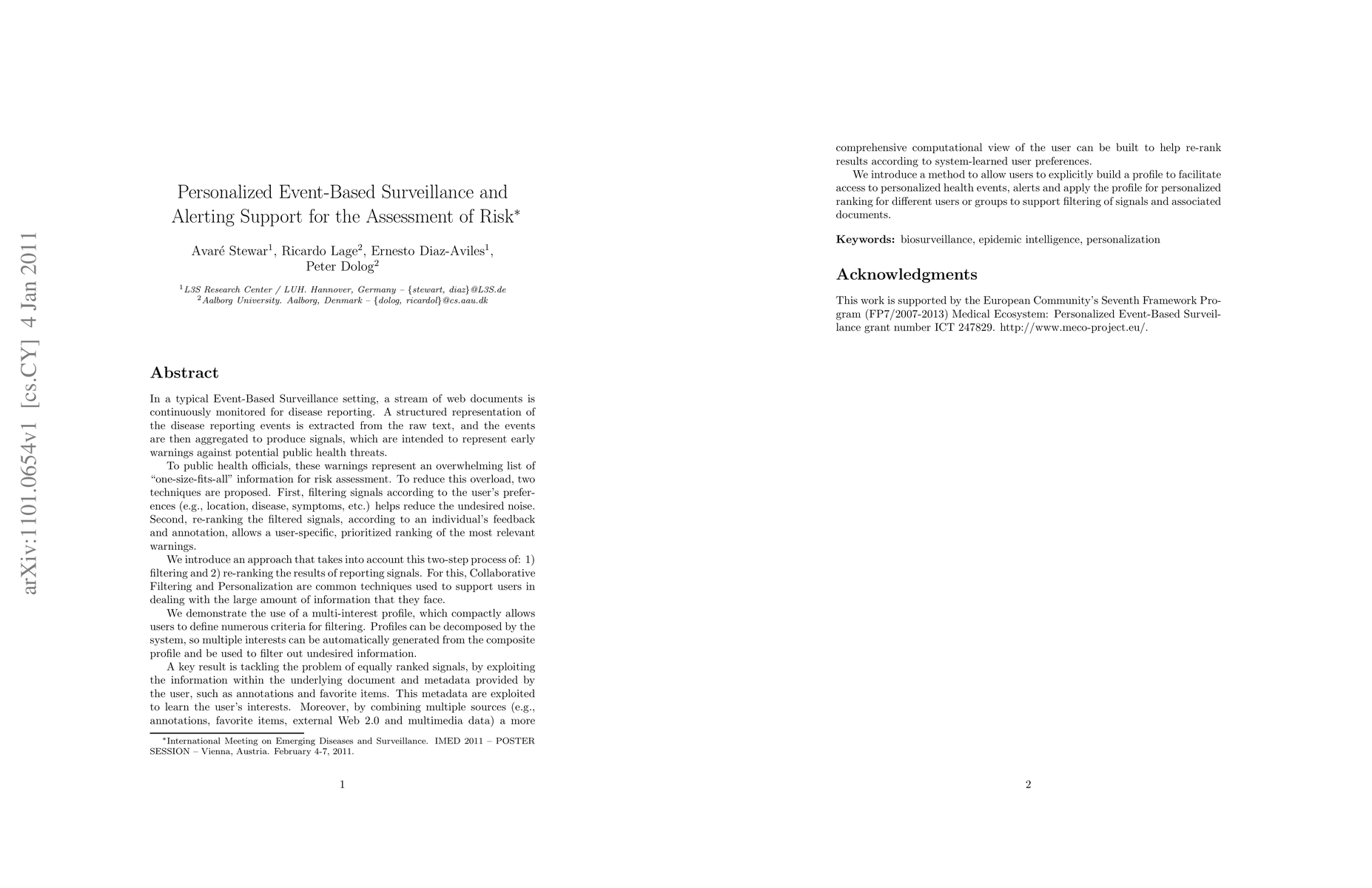 In a typical Event-Based Surveillance setting, a stream of web documents is continuously monitored for disease reporting. A structured representation of the disease reporting events is extracted from the raw text, and the events are then aggregated to produce signals, which are intended to represent early warnings against potential public health threats. To public health officials, these warnings represent an overwhelming list of "one-size-fits-all" information for risk assessment. To reduce this overload, two techniques are proposed. First, filtering signals according to the user's preferences (e.g., location, disease, symptoms, etc.) helps reduce the undesired noise. Second, re-ranking the filtered signals, according to an individual's feedback and annotation, allows a user-specific, prioritized ranking of the most relevant warnings. We introduce an approach that takes into account this two-step process of: 1) filtering and 2) re-ranking the results of reporting signals. For this, Collaborative Filtering and Personalization are common techniques used to support users in dealing with the large amount of information that they face.