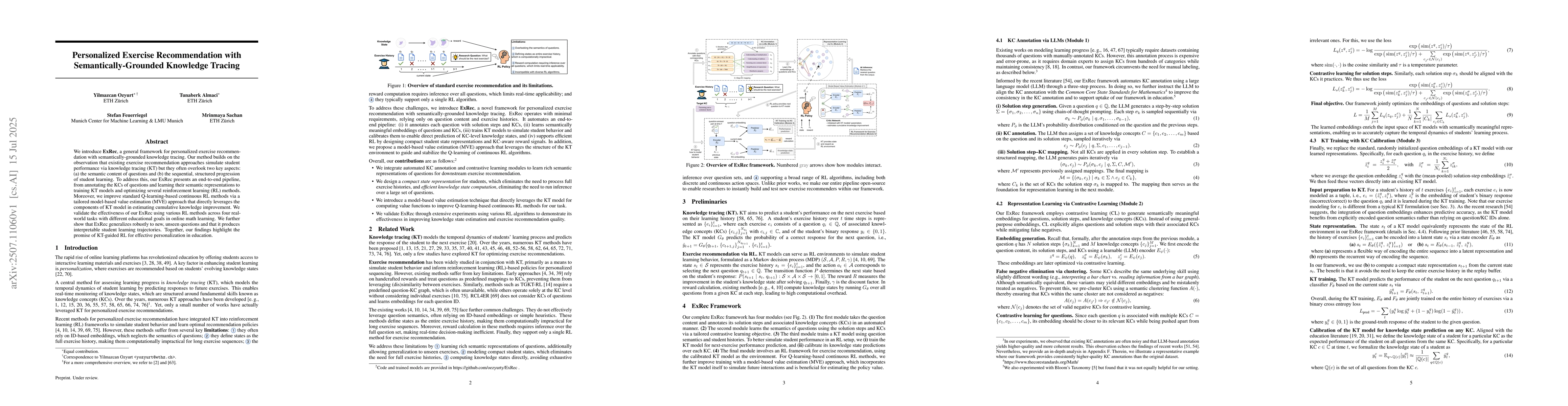 We introduce ExRec, a general framework for personalized exercise recommendation with semantically-grounded knowledge tracing. Our method builds on the observation that existing exercise recommendation approaches simulate student performance via knowledge tracing (KT) but they often overlook two key aspects: (a) the semantic content of questions and (b) the sequential, structured progression of student learning. To address this, our ExRec presents an end-to-end pipeline, from annotating the KCs of questions and learning their semantic representations to training KT models and optimizing several reinforcement learning (RL) methods. Moreover, we improve standard Q-learning-based continuous RL methods via a tailored model-based value estimation (MVE) approach that directly leverages the components of KT model in estimating cumulative knowledge improvement. We validate the effectiveness of our ExRec using various RL methods across four real-world tasks with different educational goals in online math learning. We further show that ExRec generalizes robustly to new, unseen questions and that it produces interpretable student learning trajectories. Together, our findings highlight the promise of KT-guided RL for effective personalization in education.