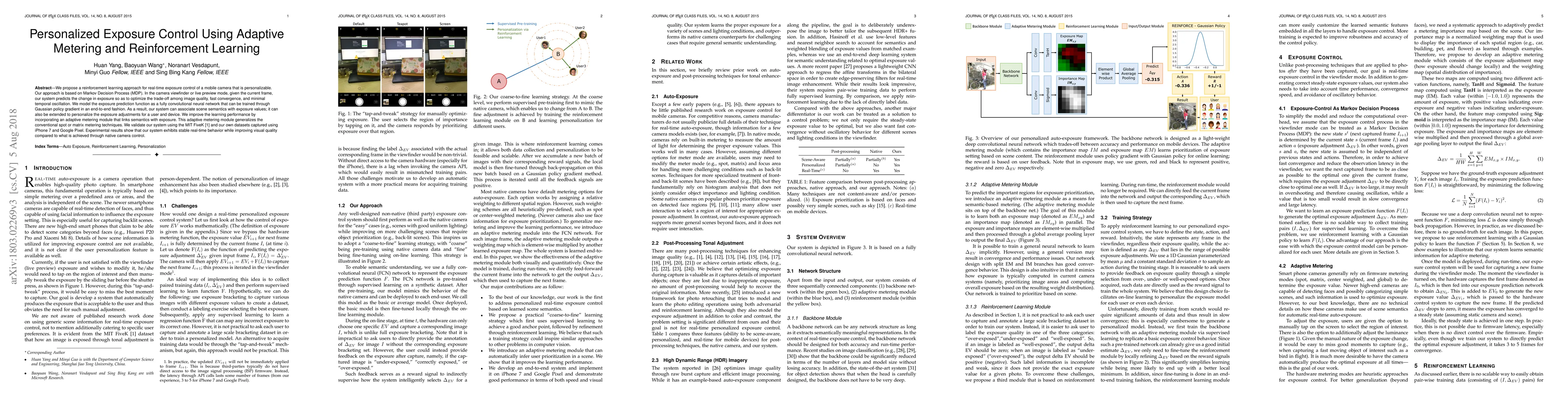 This paper proposes a reinforcement learning method for real-time, personalized exposure control in mobile cameras, optimizing image quality and convergence while minimizing temporal oscillation. The system uses a fully convolutional neural network trained via Gaussian policy gradient, enhanced by an adaptive metering module for improved learning performance.