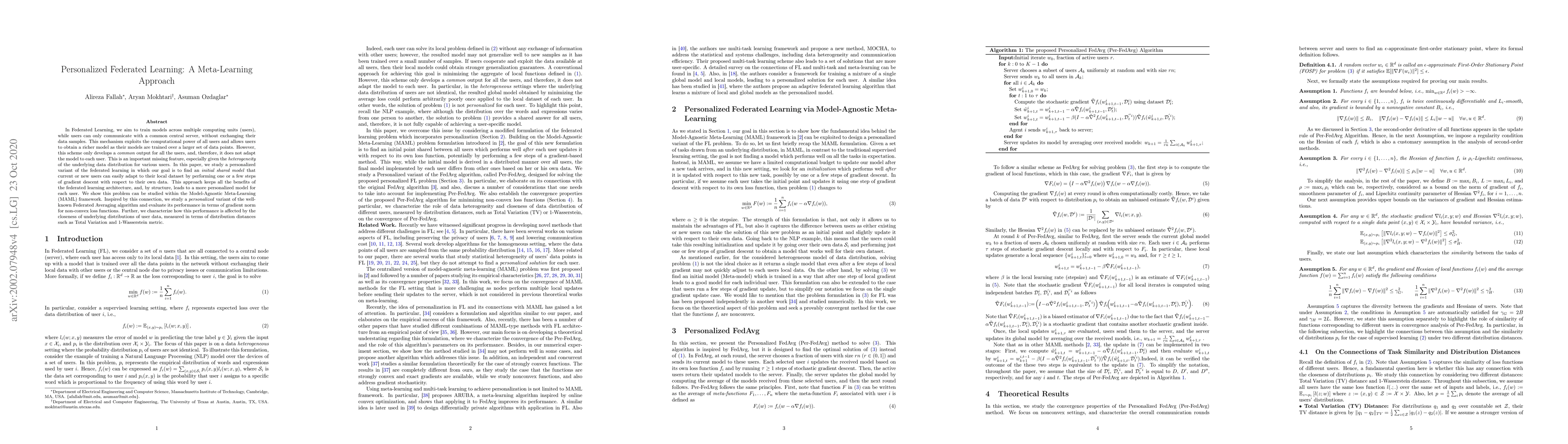 In Federated Learning, we aim to train models across multiple computing units (users), while users can only communicate with a common central server, without exchanging their data samples. This mechanism exploits the computational power of all users and allows users to obtain a richer model as their models are trained over a larger set of data points. However, this scheme only develops a common output for all the users, and, therefore, it does not adapt the model to each user. This is an important missing feature, especially given the heterogeneity of the underlying data distribution for various users. In this paper, we study a personalized variant of the federated learning in which our goal is to find an initial shared model that current or new users can easily adapt to their local dataset by performing one or a few steps of gradient descent with respect to their own data. This approach keeps all the benefits of the federated learning architecture, and, by structure, leads to a more personalized model for each user. We show this problem can be studied within the Model-Agnostic Meta-Learning (MAML) framework. Inspired by this connection, we study a personalized variant of the well-known Federated Averaging algorithm and evaluate its performance in terms of gradient norm for non-convex loss functions. Further, we characterize how this performance is affected by the closeness of underlying distributions of user data, measured in terms of distribution distances such as Total Variation and 1-Wasserstein metric.