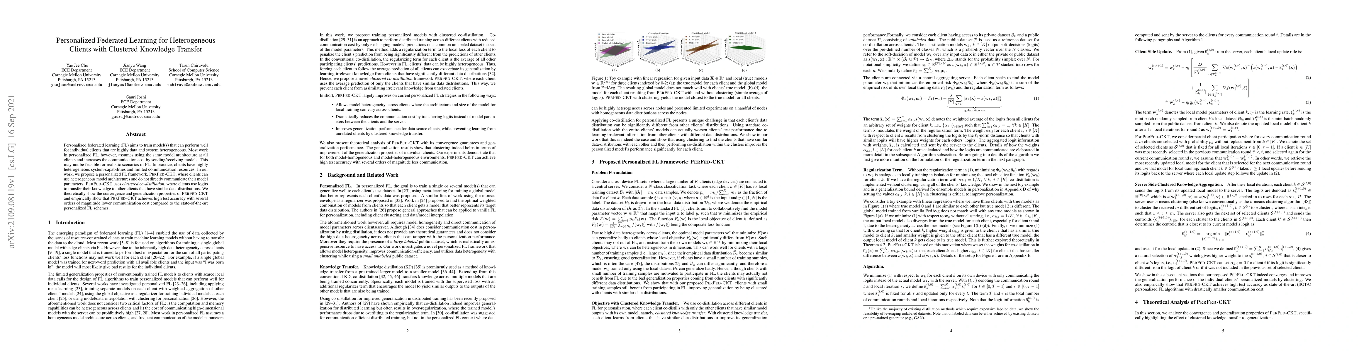 The paper proposes PerFed-CKT, a personalized federated learning framework that allows heterogeneous model architectures among clients and reduces communication costs through clustered co-distillation. This method enables knowledge transfer via logits among clients with similar data distributions, achieving high test accuracy with significantly lower communication costs compared to existing methods.