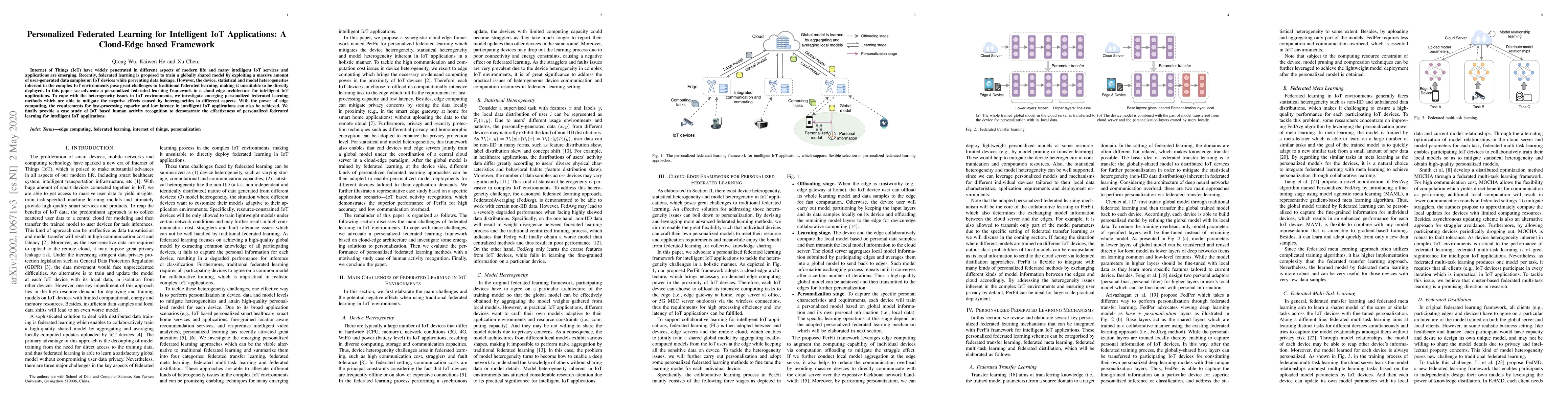 This paper proposes a personalized federated learning framework in a cloud-edge architecture to address the challenges of heterogeneity in IoT environments. It demonstrates the effectiveness of this approach through a case study on IoT-based human activity recognition.