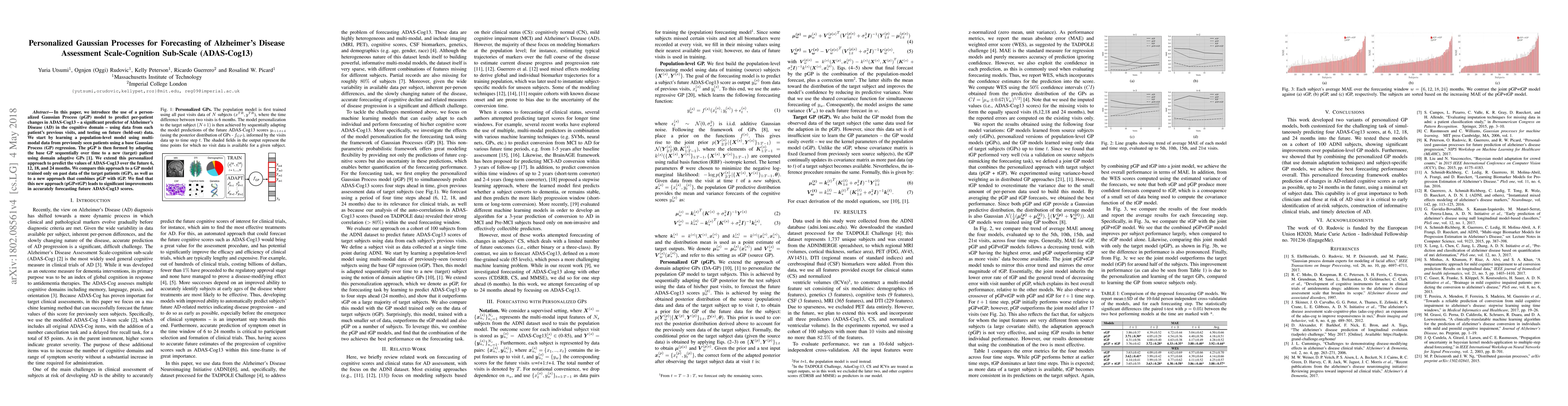 This paper proposes a personalized Gaussian Process model (pGP) to forecast changes in Alzheimer's Disease Assessment Scale-Cognition Sub-Scale (ADAS-Cog13) scores for individual patients. The approach combines a population-level model with a new patient-specific adaptation, showing significant improvements over traditional methods.