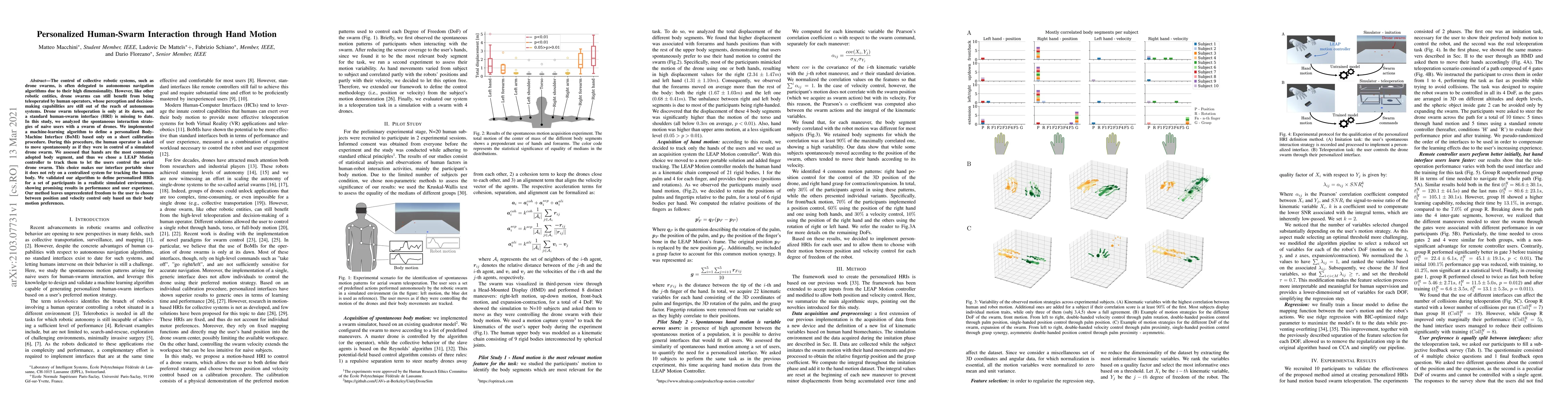 This study introduces a personalized human-swarm interaction interface using hand motion tracked by a LEAP Motion controller, enabling users to teleoperate a drone swarm based on spontaneous hand movements. The proposed machine-learning algorithm creates a Body-Machine Interface (BoMI) through a short calibration, offering users freedom in choosing between position and velocity control based on their preferred interaction style.