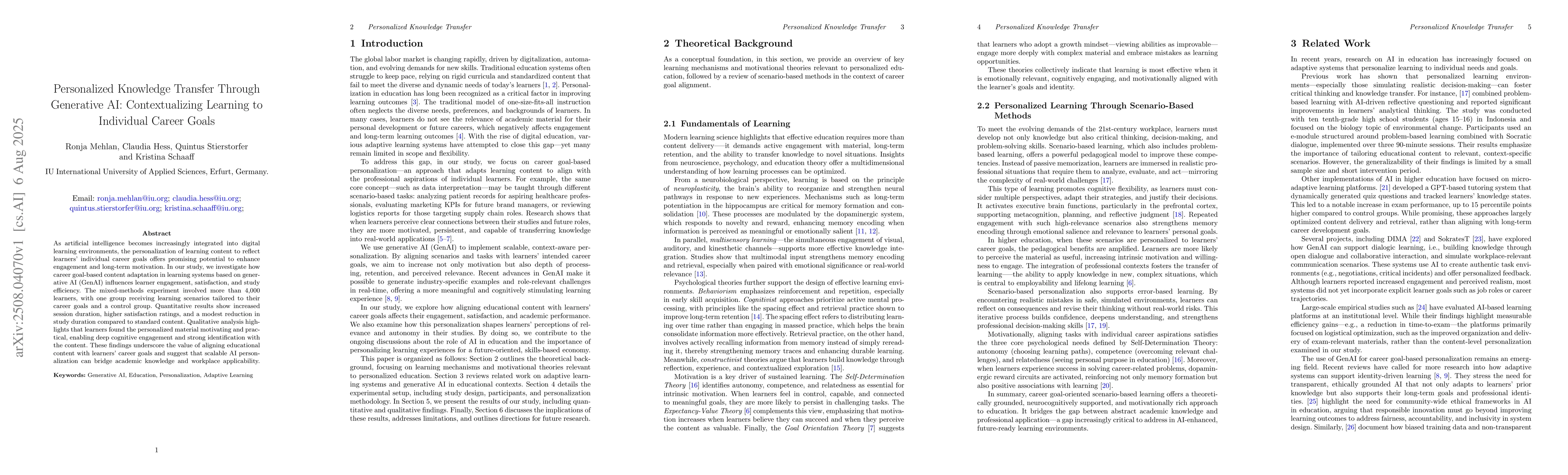 As artificial intelligence becomes increasingly integrated into digital learning environments, the personalization of learning content to reflect learners' individual career goals offers promising potential to enhance engagement and long-term motivation. In our study, we investigate how career goal-based content adaptation in learning systems based on generative AI (GenAI) influences learner engagement, satisfaction, and study efficiency. The mixed-methods experiment involved more than 4,000 learners, with one group receiving learning scenarios tailored to their career goals and a control group. Quantitative results show increased session duration, higher satisfaction ratings, and a modest reduction in study duration compared to standard content. Qualitative analysis highlights that learners found the personalized material motivating and practical, enabling deep cognitive engagement and strong identification with the content. These findings underscore the value of aligning educational content with learners' career goals and suggest that scalable AI personalization can bridge academic knowledge and workplace applicability.