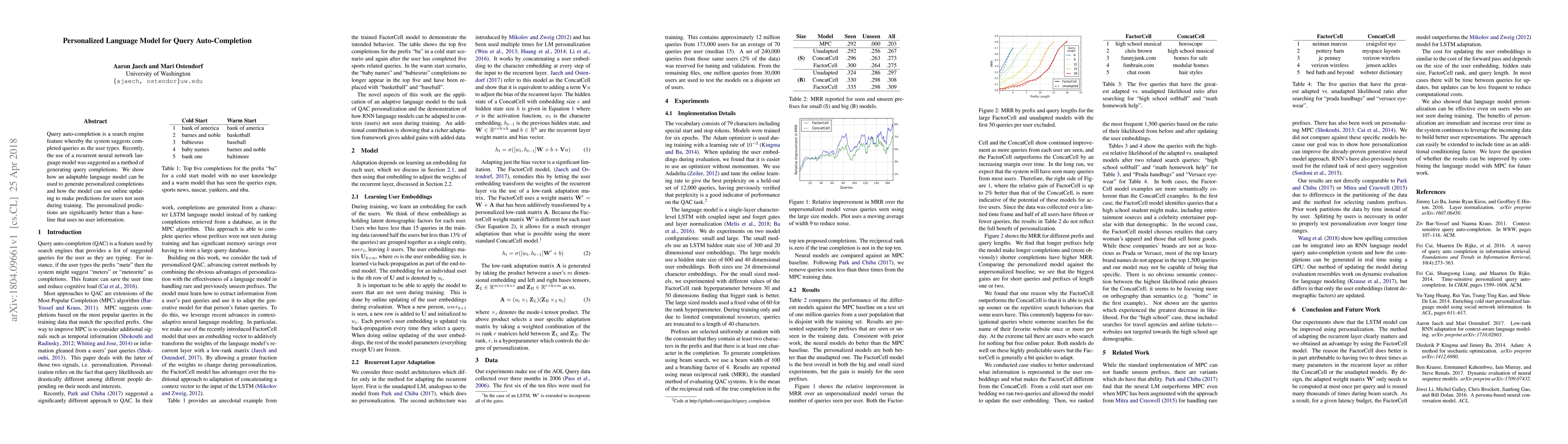 This paper explores the use of a personalized recurrent neural network language model for query auto-completion, demonstrating that it can generate better, user-specific completions compared to a baseline model, utilizing online updating to adapt to new users.