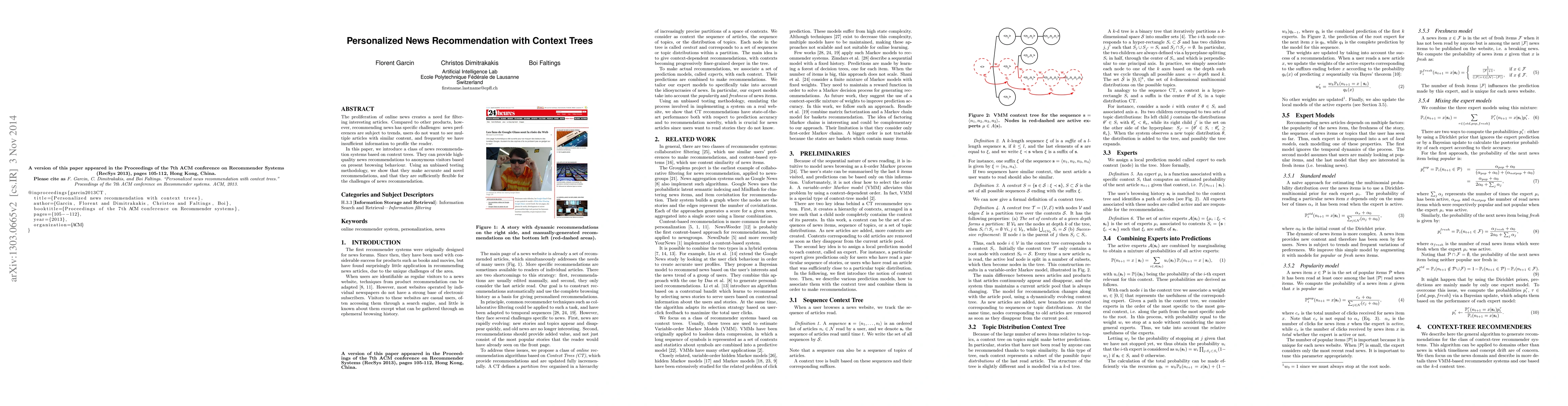 This paper proposes a novel news recommendation system using context trees, which offers accurate and novel news suggestions based on a user's current browsing behavior. The method is flexible and captures the unique aspects of news articles, proving effective for anonymous visitors.