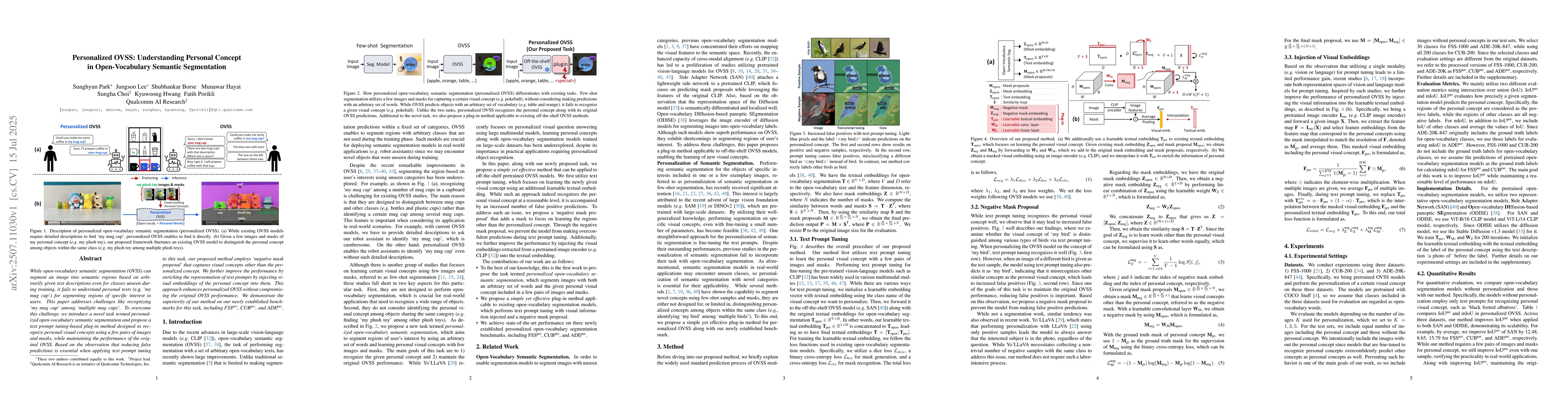 While open-vocabulary semantic segmentation (OVSS) can segment an image into semantic regions based on arbitrarily given text descriptions even for classes unseen during training, it fails to understand personal texts (e.g., `my mug cup') for segmenting regions of specific interest to users. This paper addresses challenges like recognizing `my mug cup' among `multiple mug cups'. To overcome this challenge, we introduce a novel task termed \textit{personalized open-vocabulary semantic segmentation} and propose a text prompt tuning-based plug-in method designed to recognize personal visual concepts using a few pairs of images and masks, while maintaining the performance of the original OVSS. Based on the observation that reducing false predictions is essential when applying text prompt tuning to this task, our proposed method employs `negative mask proposal' that captures visual concepts other than the personalized concept. We further improve the performance by enriching the representation of text prompts by injecting visual embeddings of the personal concept into them. This approach enhances personalized OVSS without compromising the original OVSS performance. We demonstrate the superiority of our method on our newly established benchmarks for this task, including FSS$^\text{per}$, CUB$^\text{per}$, and ADE$^\text{per}$.