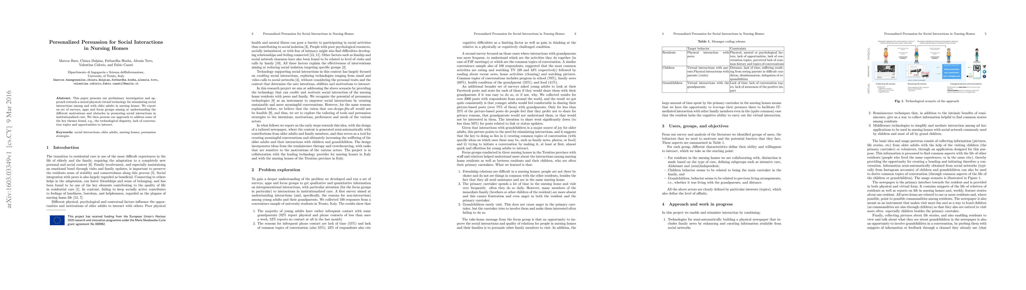 This paper explores a mixed physical-virtual technology to enhance social interactions among older adults in nursing homes, based on surveys, apps, and focus groups. The study addresses key themes like technological disparity and lack of interaction opportunities.