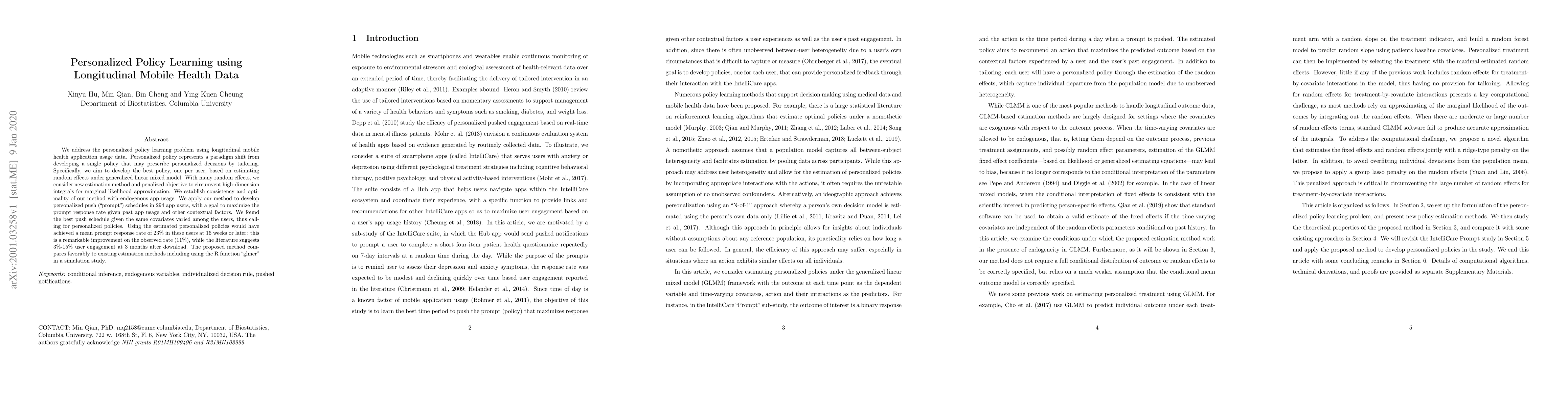 This paper develops personalized policy learning methods for mobile health applications using longitudinal data, proposing a new estimation technique to handle high-dimensional random effects. The method achieves a 23% prompt response rate, significantly outperforming the observed 11% and existing methods.