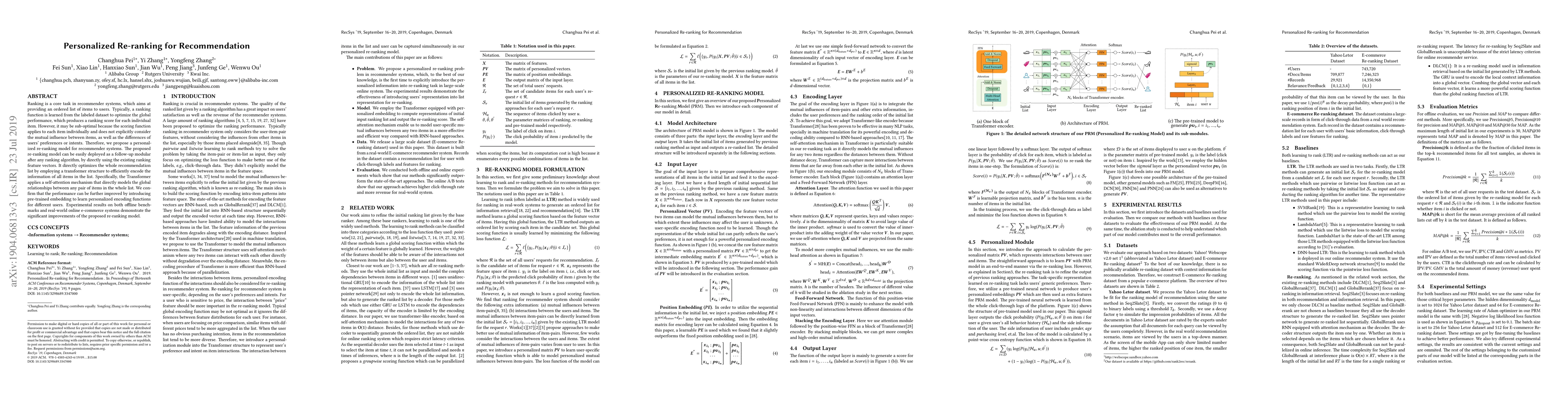 The paper proposes a personalized re-ranking model for recommender systems that enhances item rankings by considering global item relationships and user preferences, using a transformer structure with self-attention and pre-trained embeddings, showing significant performance improvements in offline and online experiments.