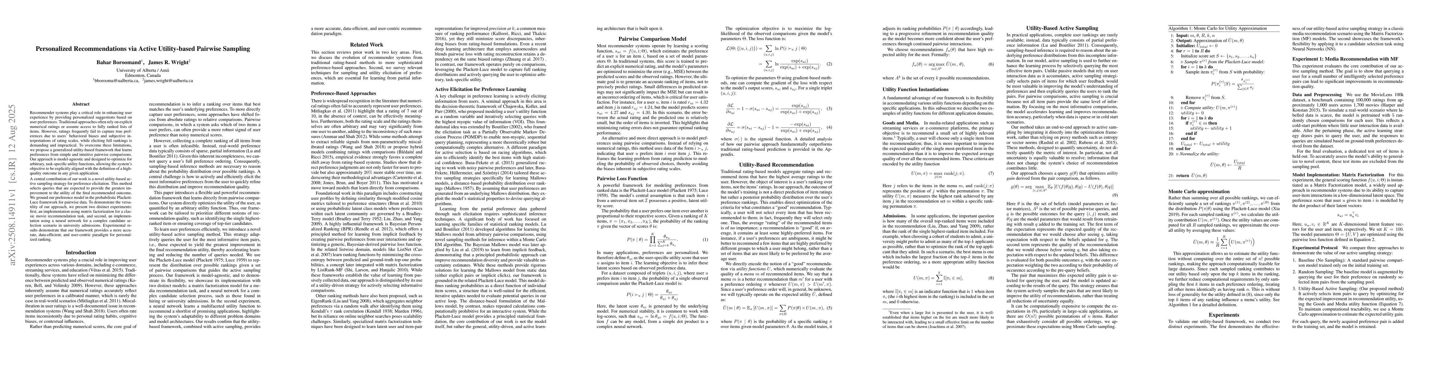 Recommender systems play a critical role in enhancing user experience by providing personalized suggestions based on user preferences. Traditional approaches often rely on explicit numerical ratings or assume access to fully ranked lists of items. However, ratings frequently fail to capture true preferences due to users' behavioral biases and subjective interpretations of rating scales, while eliciting full rankings is demanding and impractical. To overcome these limitations, we propose a generalized utility-based framework that learns preferences from simple and intuitive pairwise comparisons. Our approach is model-agnostic and designed to optimize for arbitrary, task-specific utility functions, allowing the system's objective to be explicitly aligned with the definition of a high-quality outcome in any given application. A central contribution of our work is a novel utility-based active sampling strategy for preference elicitation. This method selects queries that are expected to provide the greatest improvement to the utility of the final recommended outcome. We ground our preference model in the probabilistic Plackett-Luce framework for pairwise data. To demonstrate the versatility of our approach, we present two distinct experiments: first, an implementation using matrix factorization for a classic movie recommendation task, and second, an implementation using a neural network for a complex candidate selection scenario in university admissions. Experimental results demonstrate that our framework provides a more accurate, data-efficient, and user-centric paradigm for personalized ranking.