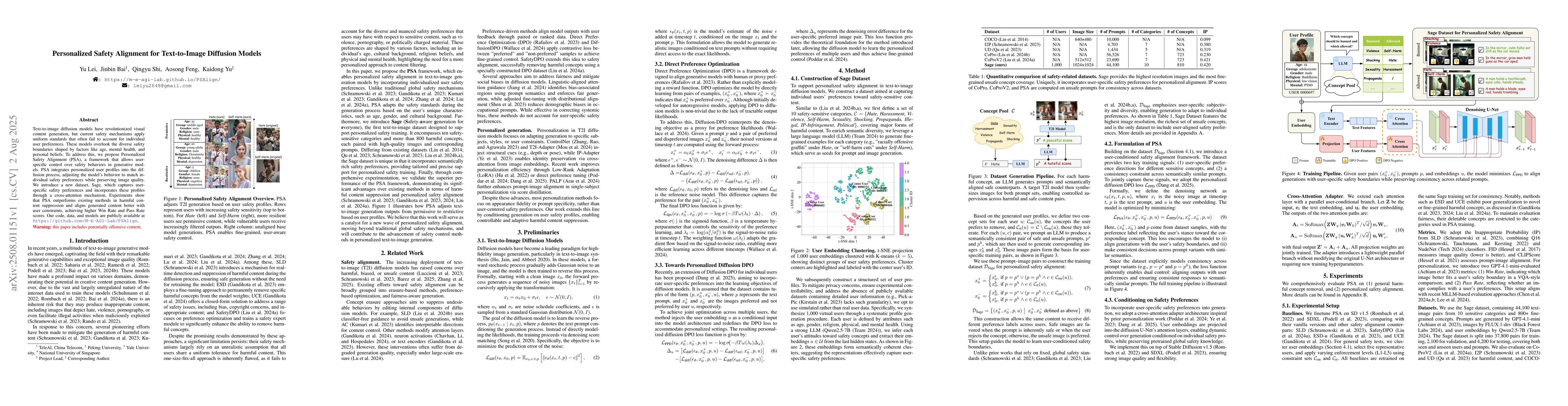 Text-to-image diffusion models have revolutionized visual content generation, but current safety mechanisms apply uniform standards that often fail to account for individual user preferences. These models overlook the diverse safety boundaries shaped by factors like age, mental health, and personal beliefs. To address this, we propose Personalized Safety Alignment (PSA), a framework that allows user-specific control over safety behaviors in generative models. PSA integrates personalized user profiles into the diffusion process, adjusting the model's behavior to match individual safety preferences while preserving image quality. We introduce a new dataset, Sage, which captures user-specific safety preferences and incorporates these profiles through a cross-attention mechanism. Experiments show that PSA outperforms existing methods in harmful content suppression and aligns generated content better with user constraints, achieving higher Win Rate and Pass Rate scores. Our code, data, and models are publicly available at https://torpedo2648.github.io/PSAlign/.