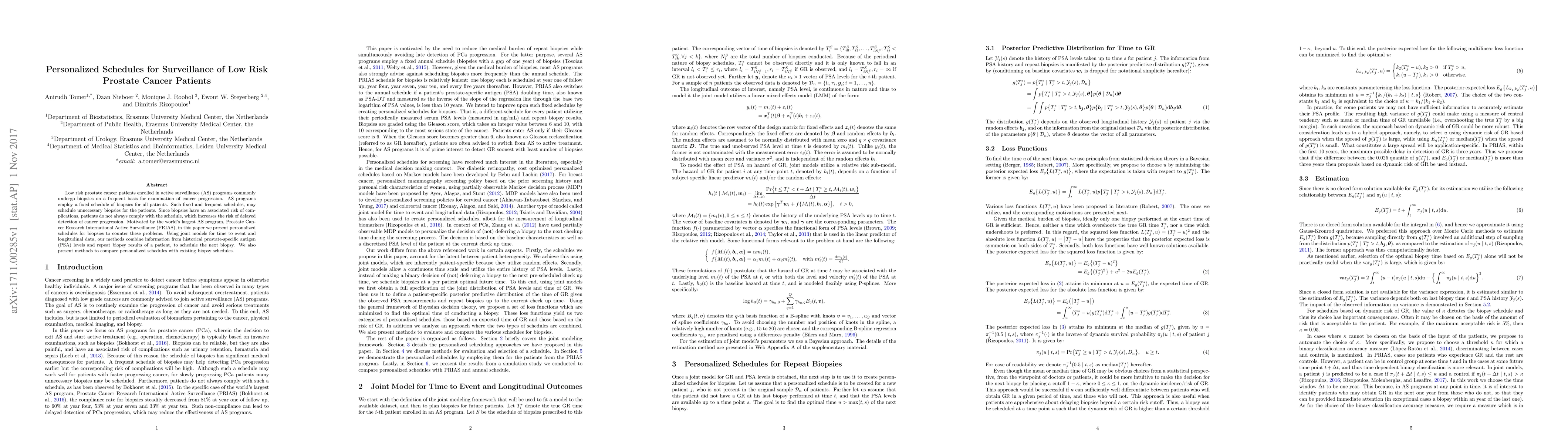 This paper proposes personalized biopsy schedules for low-risk prostate cancer patients in active surveillance programs, aiming to reduce unnecessary biopsies and improve compliance. The method uses joint models incorporating historical PSA levels and biopsy results to tailor schedules, potentially minimizing complications and enhancing early detection.