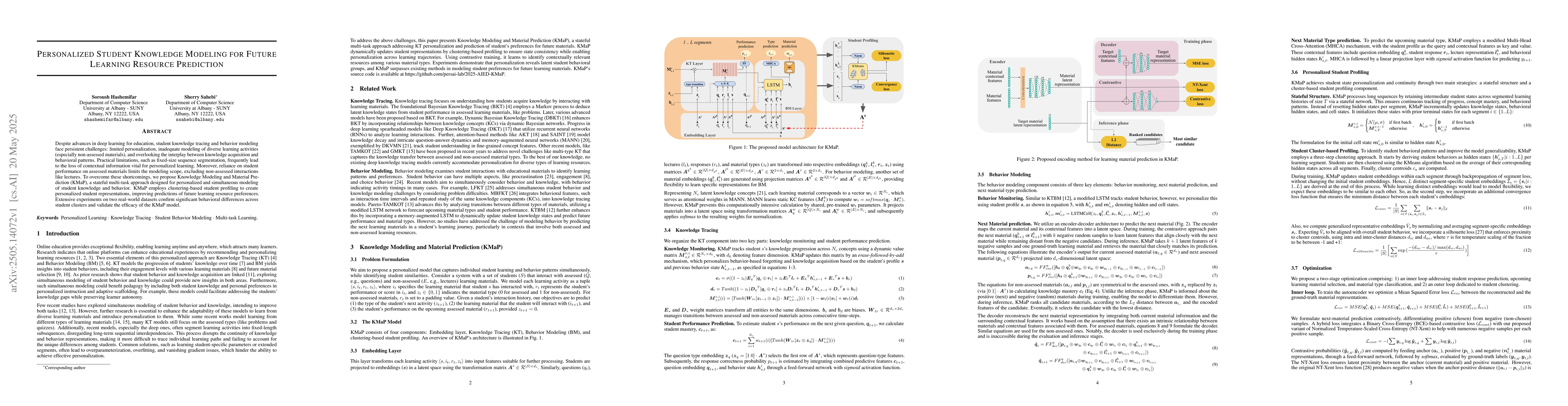 Despite advances in deep learning for education, student knowledge tracing and behavior modeling face persistent challenges: limited personalization, inadequate modeling of diverse learning activities (especially non-assessed materials), and overlooking the interplay between knowledge acquisition and behavioral patterns. Practical limitations, such as fixed-size sequence segmentation, frequently lead to the loss of contextual information vital for personalized learning. Moreover, reliance on student performance on assessed materials limits the modeling scope, excluding non-assessed interactions like lectures. To overcome these shortcomings, we propose Knowledge Modeling and Material Prediction (KMaP), a stateful multi-task approach designed for personalized and simultaneous modeling of student knowledge and behavior. KMaP employs clustering-based student profiling to create personalized student representations, improving predictions of future learning resource preferences. Extensive experiments on two real-world datasets confirm significant behavioral differences across student clusters and validate the efficacy of the KMaP model.