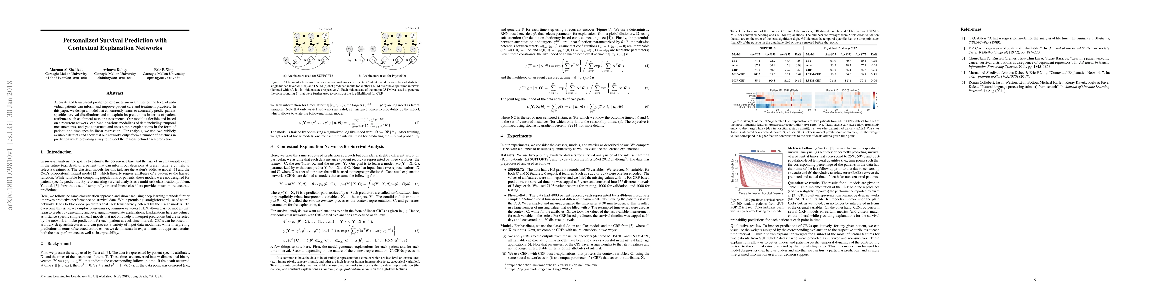 Accurate and transparent prediction of cancer survival times on the level of individual patients can inform and improve patient care and treatment practices. In this paper, we design a model that concurrently learns to accurately predict patient-specific survival distributions and to explain its predictions in terms of patient attributes such as clinical tests or assessments. Our model is flexible and based on a recurrent network, can handle various modalities of data including temporal measurements, and yet constructs and uses simple explanations in the form of patient- and time-specific linear regression. For analysis, we use two publicly available datasets and show that our networks outperform a number of baselines in prediction while providing a way to inspect the reasons behind each prediction.