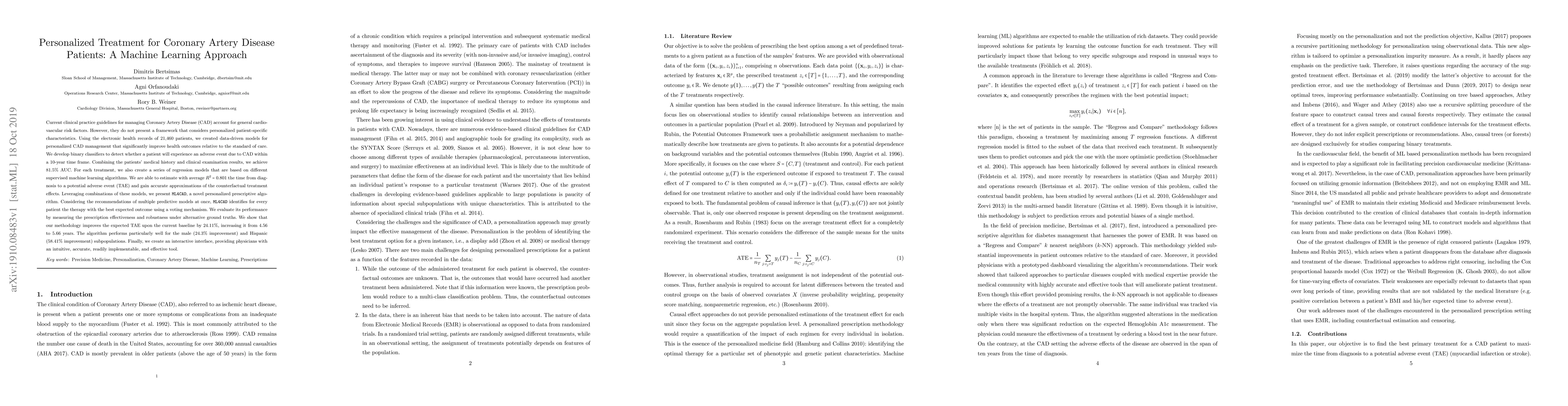 This paper develops machine learning models to personalize treatment for Coronary Artery Disease (CAD) patients, significantly improving health outcomes compared to standard care. The proposed ML4CAD algorithm, combining predictive models, identifies the best therapy for each patient, extending the time to adverse events by 24.11% on average, with notable improvements in male and Hispanic subpopulations.