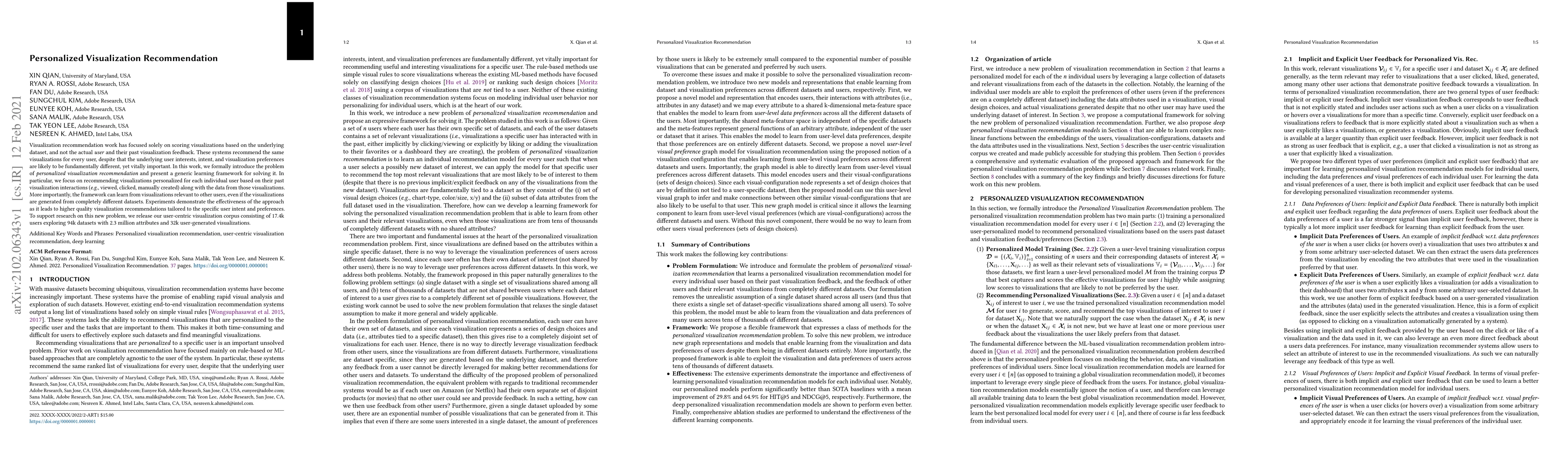 This paper introduces a framework for personalized visualization recommendation, addressing the limitation of existing systems that ignore user-specific preferences. The proposed method recommends visualizations tailored to individual users based on their interaction history and data, achieving higher quality recommendations. The authors also release a large user-centric visualization corpus to support further research.