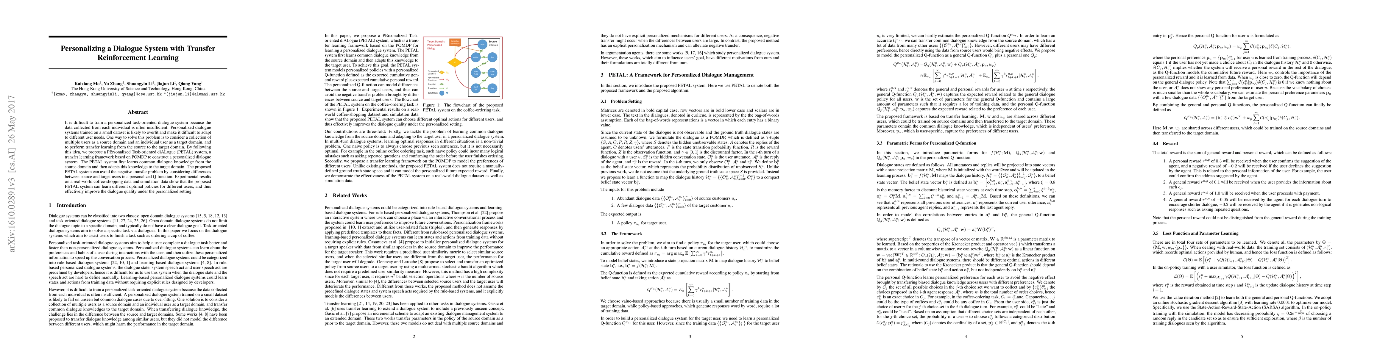 This paper proposes PETAL, a transfer reinforcement learning framework for personalizing task-oriented dialogue systems using POMDP. The framework learns common dialogue knowledge from a source domain and adapts it to individual users, effectively improving dialogue quality by choosing optimal actions tailored to each user.