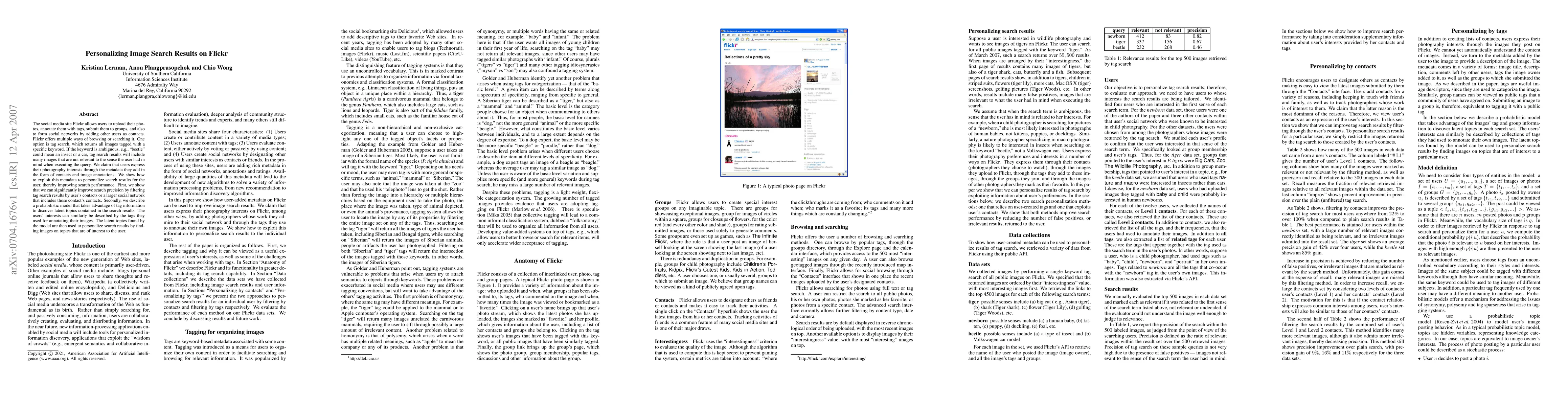This paper proposes a method to personalize image search results on Flickr by leveraging user-provided metadata, including contacts and image annotations. The approach enhances search precision by filtering results based on social networks and employs a probabilistic model to identify latent topics, which are then used to tailor search results to the user's interests.