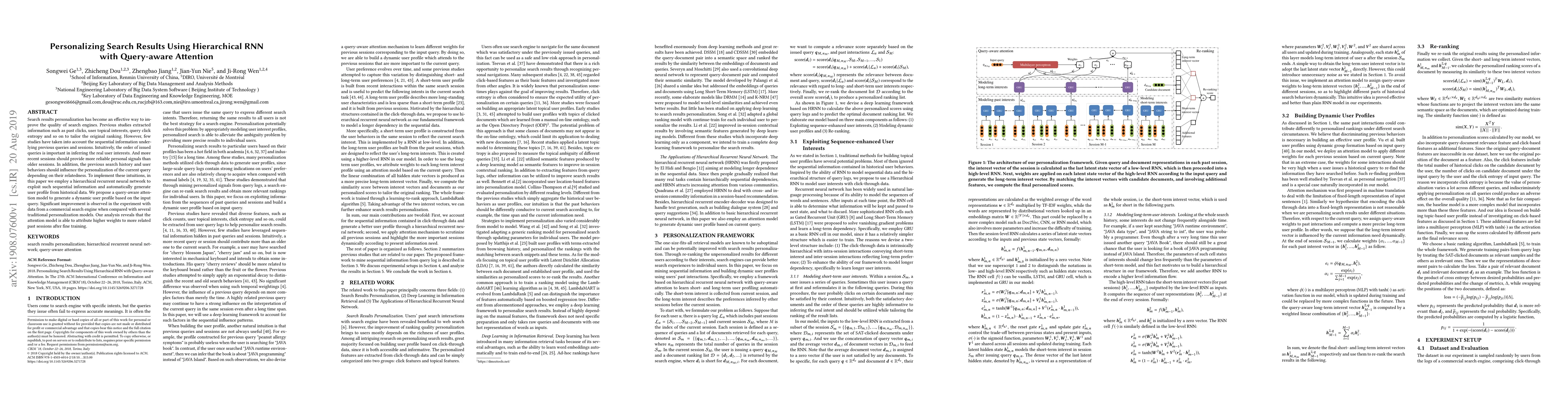 This paper introduces a hierarchical RNN with query-aware attention to personalize search results, leveraging sequential information from past queries and sessions. Experiments show significant improvement over traditional models, with the attention model effectively prioritizing relevant past sessions.