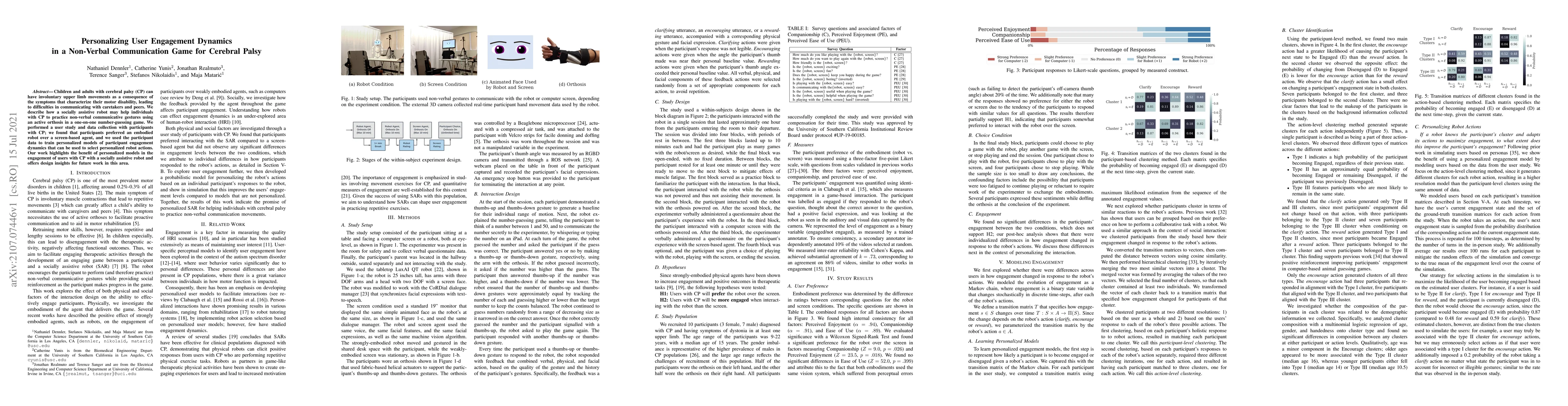 Children and adults with cerebral palsy (CP) can have involuntary upper limb movements as a consequence of the symptoms that characterize their motor disability, leading to difficulties in communicating with caretakers and peers. We describe how a socially assistive robot may help individuals with CP to practice non-verbal communicative gestures using an active orthosis in a one-on-one number-guessing game. We performed a user study and data collection with participants with CP; we found that participants preferred an embodied robot over a screen-based agent, and we used the participant data to train personalized models of participant engagement dynamics that can be used to select personalized robot actions. Our work highlights the benefit of personalized models in the engagement of users with CP with a socially assistive robot and offers design insights for future work in this area.