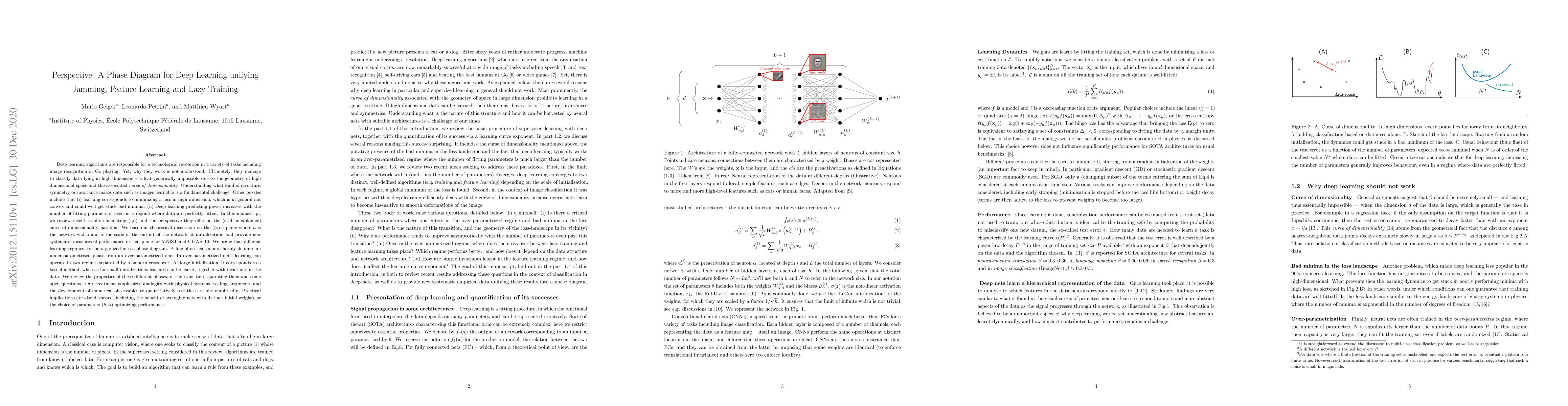 Deep learning algorithms are responsible for a technological revolution in a variety of tasks including image recognition or Go playing. Yet, why they work is not understood. Ultimately, they manage to classify data lying in high dimension -- a feat generically impossible due to the geometry of high dimensional space and the associated curse of dimensionality. Understanding what kind of structure, symmetry or invariance makes data such as images learnable is a fundamental challenge. Other puzzles include that (i) learning corresponds to minimizing a loss in high dimension, which is in general not convex and could well get stuck bad minima. (ii) Deep learning predicting power increases with the number of fitting parameters, even in a regime where data are perfectly fitted. In this manuscript, we review recent results elucidating (i,ii) and the perspective they offer on the (still unexplained) curse of dimensionality paradox. We base our theoretical discussion on the $(h,\alpha)$ plane where $h$ is the network width and $\alpha$ the scale of the output of the network at initialization, and provide new systematic measures of performance in that plane for MNIST and CIFAR 10. We argue that different learning regimes can be organized into a phase diagram. A line of critical points sharply delimits an under-parametrised phase from an over-parametrized one. In over-parametrized nets, learning can operate in two regimes separated by a smooth cross-over. At large initialization, it corresponds to a kernel method, whereas for small initializations features can be learnt, together with invariants in the data. We review the properties of these different phases, of the transition separating them and some open questions. Our treatment emphasizes analogies with physical systems, scaling arguments and the development of numerical observables to quantitatively test these results empirically.