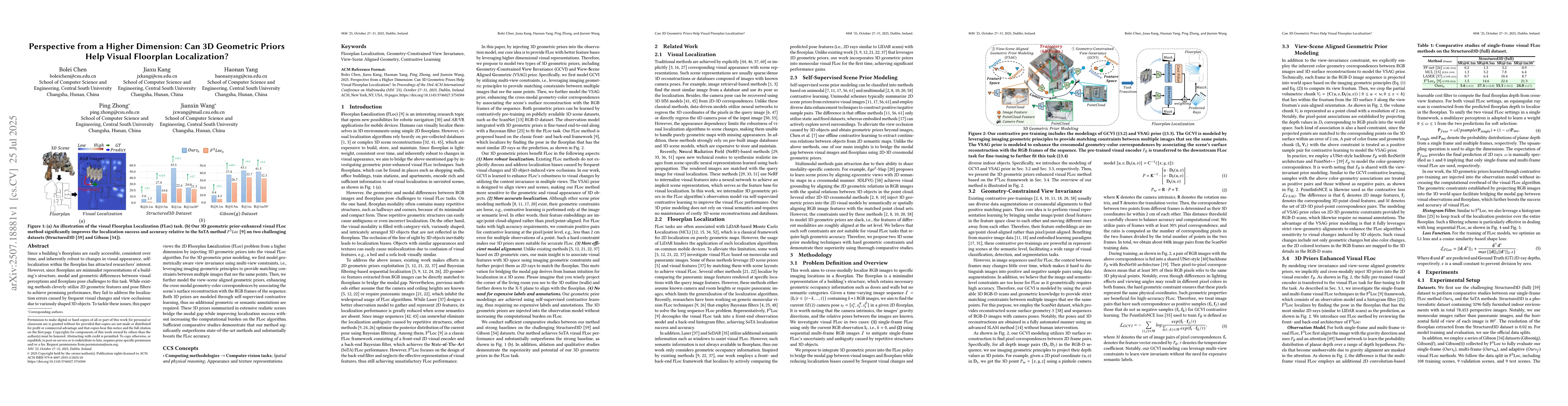 Since a building's floorplans are easily accessible, consistent over time, and inherently robust to changes in visual appearance, self-localization within the floorplan has attracted researchers' interest. However, since floorplans are minimalist representations of a building's structure, modal and geometric differences between visual perceptions and floorplans pose challenges to this task. While existing methods cleverly utilize 2D geometric features and pose filters to achieve promising performance, they fail to address the localization errors caused by frequent visual changes and view occlusions due to variously shaped 3D objects. To tackle these issues, this paper views the 2D Floorplan Localization (FLoc) problem from a higher dimension by injecting 3D geometric priors into the visual FLoc algorithm. For the 3D geometric prior modeling, we first model geometrically aware view invariance using multi-view constraints, i.e., leveraging imaging geometric principles to provide matching constraints between multiple images that see the same points. Then, we further model the view-scene aligned geometric priors, enhancing the cross-modal geometry-color correspondences by associating the scene's surface reconstruction with the RGB frames of the sequence. Both 3D priors are modeled through self-supervised contrastive learning, thus no additional geometric or semantic annotations are required. These 3D priors summarized in extensive realistic scenes bridge the modal gap while improving localization success without increasing the computational burden on the FLoc algorithm. Sufficient comparative studies demonstrate that our method significantly outperforms state-of-the-art methods and substantially boosts the FLoc accuracy. All data and code will be released after the anonymous review.