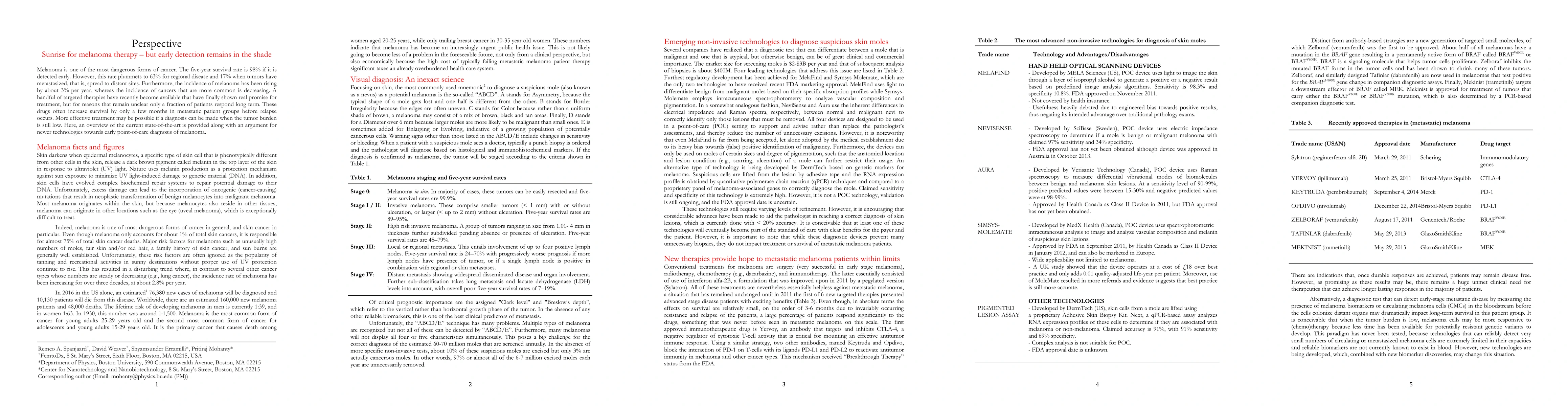 Melanoma is one of the most dangerous forms of cancer. The five-year survival rate is 98% if it is detected early. However, this rate plummets to 63% for regional disease and 17% when tumors have metastasized, that is, spread to distant sites. Furthermore, the incidence of melanoma has been rising by about 3% per year, whereas the incidence of cancers that are more common is decreasing. A handful of targeted therapies have recently become available that have finally shown real promise for treatment, but for reasons that remain unclear only a fraction of patients respond long term. These drugs often increase survival by only a few months in metastatic patient groups before relapse occurs. More effective treatment may be possible if a diagnosis can be made when the tumor burden is still low. Here, an overview of the current state-of-the-art is provided along with an argument for newer technologies towards early point-of-care diagnosis of melanoma.