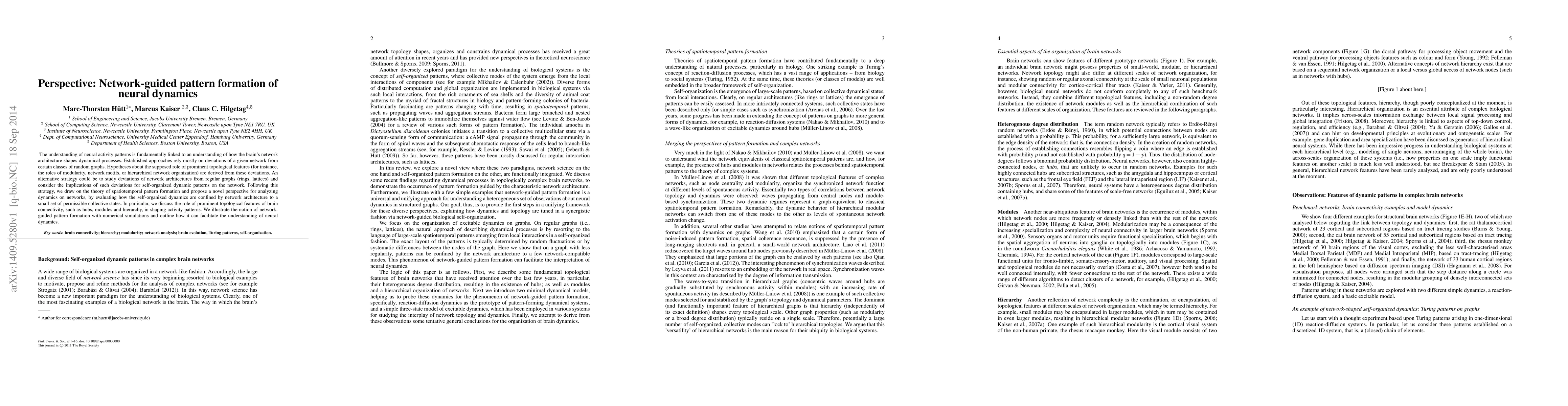 The understanding of neural activity patterns is fundamentally linked to an understanding of how the brain's network architecture shapes dynamical processes. Established approaches rely mostly on deviations of a given network from certain classes of random graphs. Hypotheses about the supposed role of prominent topological features (for instance, the roles of modularity, network motifs, or hierarchical network organization) are derived from these deviations. An alternative strategy could be to study deviations of network architectures from regular graphs (rings, lattices) and consider the implications of such deviations for self-organized dynamic patterns on the network. Following this strategy, we draw on the theory of spatiotemporal pattern formation and propose a novel perspective for analyzing dynamics on networks, by evaluating how the self-organized dynamics are confined by network architecture to a small set of permissible collective states. In particular, we discuss the role of prominent topological features of brain connectivity, such as hubs, modules and hierarchy, in shaping activity patterns. We illustrate the notion of network-guided pattern formation with numerical simulations and outline how it can facilitate the understanding of neural dynamics.
