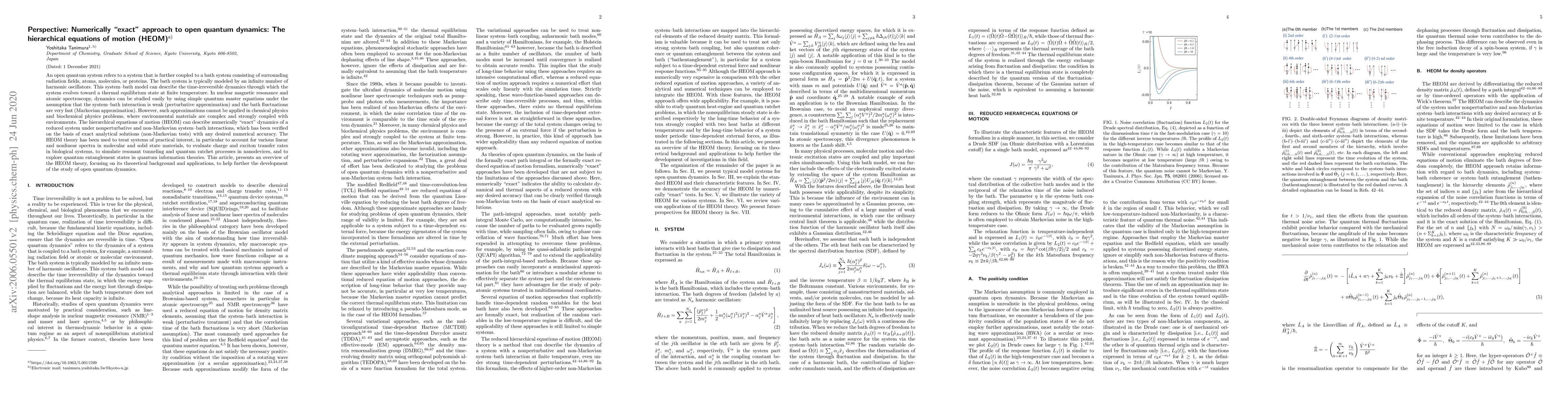 The paper discusses the hierarchical equations of motion (HEOM) as a numerically "exact" approach for open quantum dynamics in systems strongly coupled to complex environments. HEOM provides nonperturbative and non-Markovian descriptions, surpassing limitations of perturbative and Markovian approximations, and has been applied to various fields including molecular spectroscopy, biological charge transfer, and quantum information.