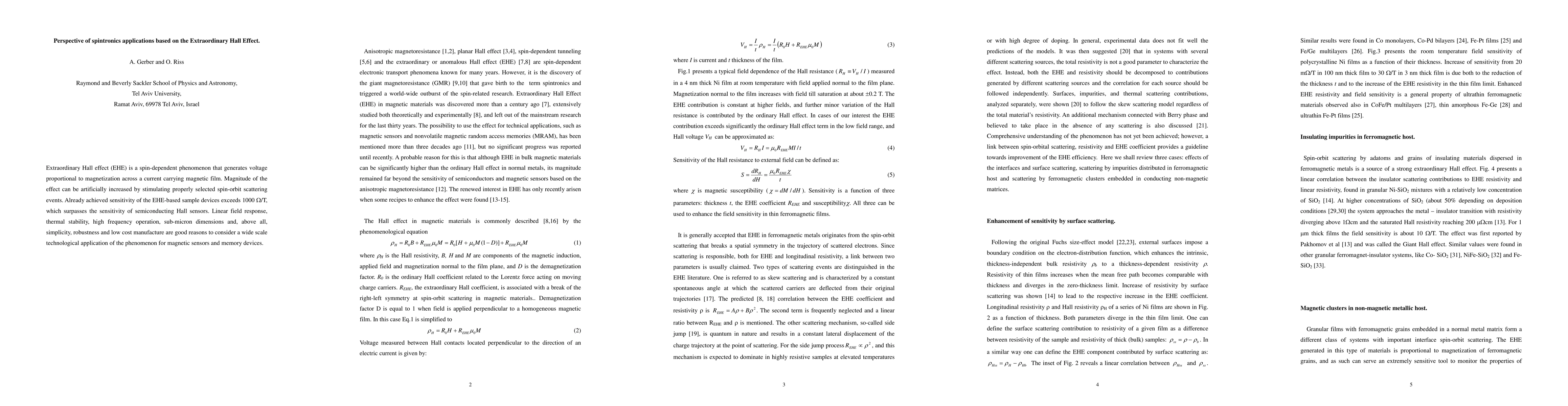 Extraordinary Hall effect (EHE) is a spin-dependent phenomenon that generates voltage proportional to magnetization across a current carrying magnetic film. Magnitude of the effect can be artificially increased by stimulating properly selected spin-orbit scattering events. Already achieved sensitivity of the EHE-based sample devices exceeds 1000 Ohm/T, which surpasses the sensitivity of semiconducting Hall sensors. Linear field response, thermal stability, high frequency operation, sub-micron dimensions and, above all, simplicity, robustness and low cost manufacture are good reasons to consider a wide scale technological application of the phenomenon for magnetic sensors and memory devices.
