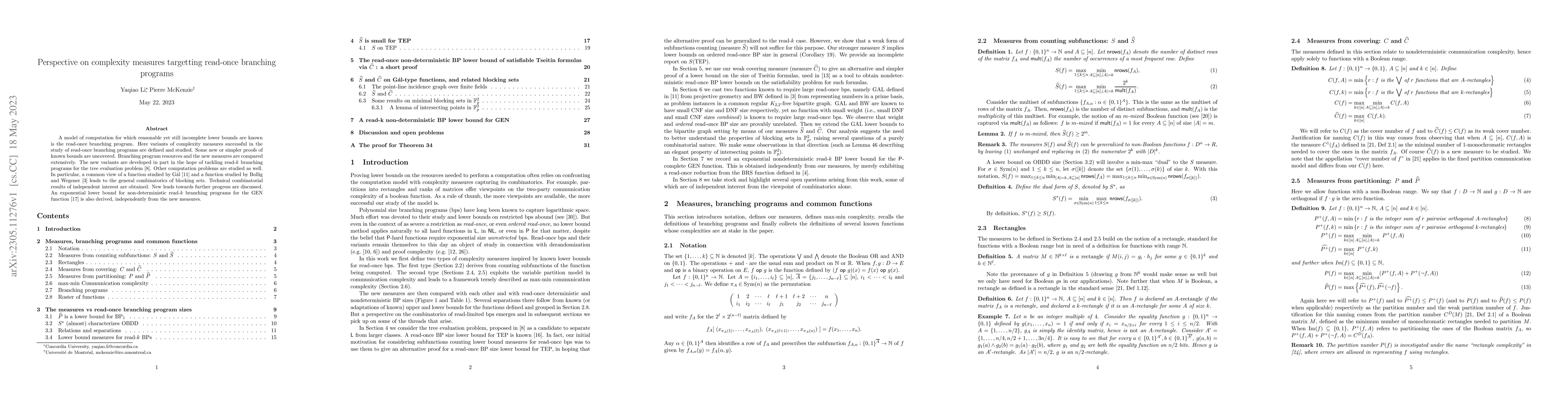 A model of computation for which reasonable yet still incomplete lower bounds are known is the read-once branching program. Here variants of complexity measures successful in the study of read-once branching programs are defined and studied. Some new or simpler proofs of known bounds are uncovered. Branching program resources and the new measures are compared extensively. The new variants are developed in part in the hope of tackling read-k branching programs for the tree evaluation problem studied in Cook et al. Other computation problems are studied as well. In particular, a common view of a function studied by Gal and a function studied by Bollig and Wegener leads to the general combinatorics of blocking sets. Technical combinatorial results of independent interest are obtained. New leads towards further progress are discussed. An exponential lower bound for non-deterministic read-k branching programs for the GEN function is also derived, independently from the new measures.