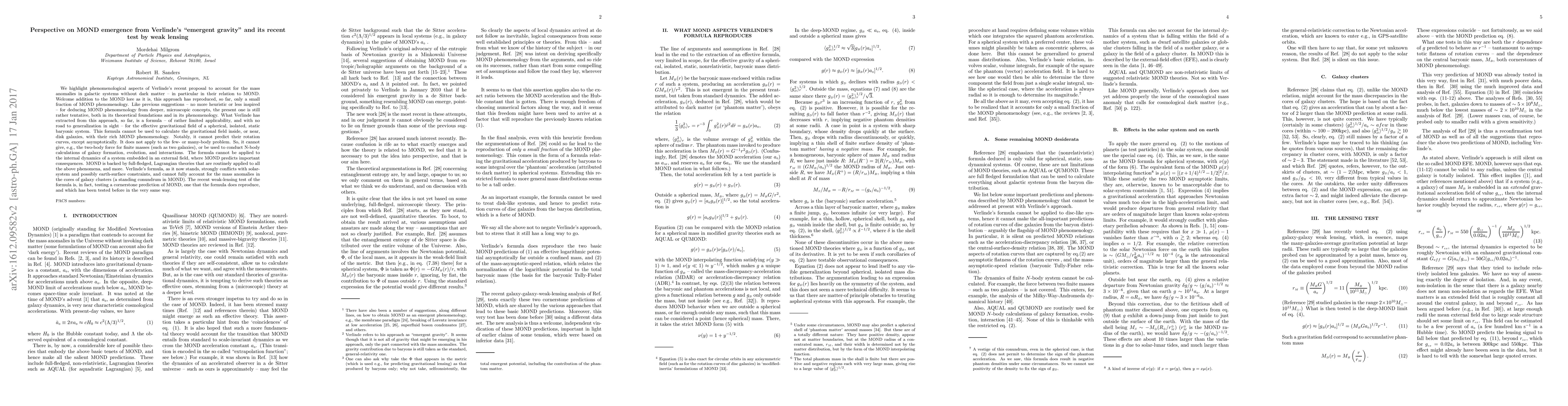 We highlight phenomenological aspects of Verlinde's recent proposal to account for the mass anomalies in galactic systems without dark matter -- in particular in their relation to MOND. Welcome addition to the MOND lore as it is, this approach have reproduced, so far, only a small fraction of MOND phenomenology, and is still rather tentative, both in its theoretical foundations and in its phenomenology. What Verlinde has extracted from this approach, so far, is a formula -- of rather limited applicability, and with no road to generalization in sight -- for the effective gravitational field of a spherical, isolated, static baryonic system. This formula cannot be used to calculate the gravitational field of disk galaxies, with their rich MOND phenomenology. Notably, it cannot predict their rotation curves, except asymptotically. It does not apply to the few-, or many-body problem; so, it cannot give, e.g., the two-body force between two galaxies, or be used to conduct N-body calculations of galaxy formation, evolution, and interactions. The formula cannot be applied to the internal dynamics of a system embedded in an external field, where MOND predicts important consequences. etc. MOND is backed by full-fledged, Lagrangian theories that can be, and are, routinely applied to all the above phenomena, and more. Verlinde's formula, as it now stands, strongly conflicts with solar-system and possibly earth-surface constraints, and cannot fully account for the mass anomalies in the cores of galaxy clusters (a standing conundrum in MOND). The recent weak-lensing test of the formula is, in fact, testing a cornerstone prediction of MOND, one that the formula does reproduce, and which has been tested before in the very same way.