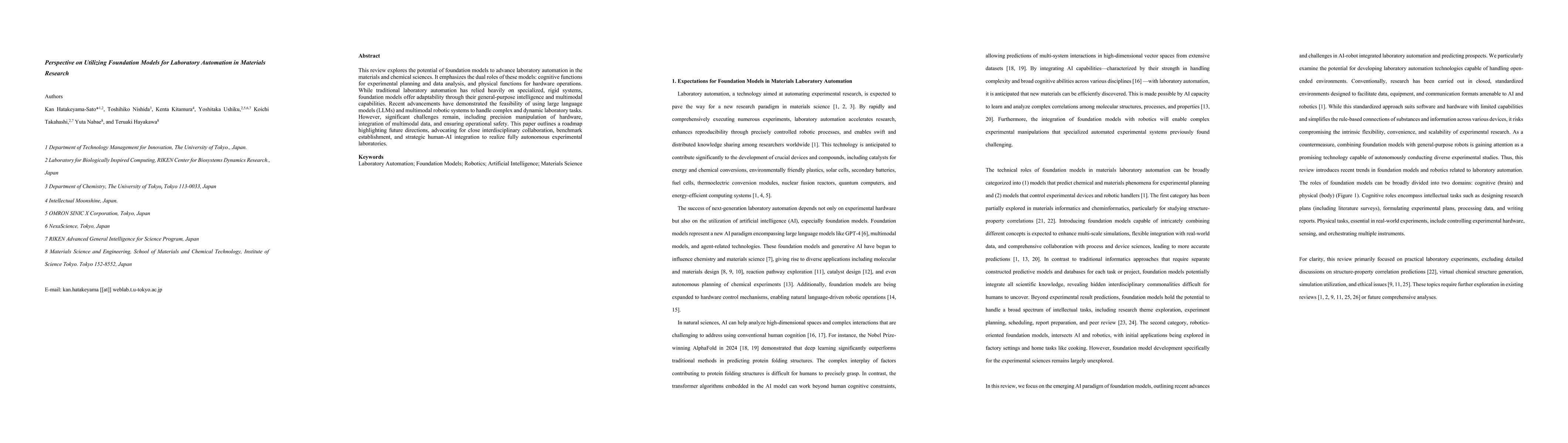 The paper reviews the potential of foundation models in automating materials research labs, highlighting their roles in cognitive tasks like experimental planning and physical tasks such as hardware operations. It discusses recent progress with LLMs and multimodal robots, but also points out challenges like hardware precision, multimodal data integration, and safety, advocating for interdisciplinary collaboration and human-AI integration for future autonomous labs.