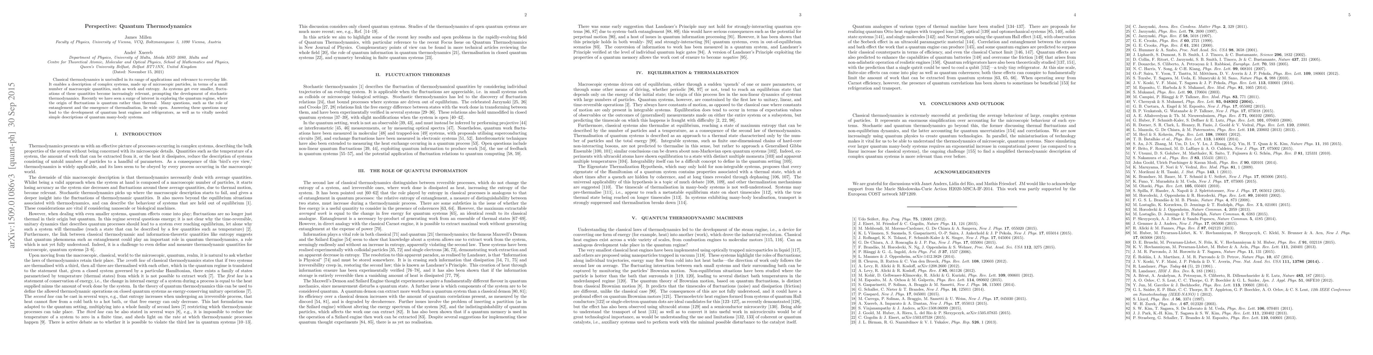 Classical thermodynamics is unrivalled in its range of applications and relevance to everyday life. It enables a description of complex systems, made up of microscopic particles, in terms of a small number of macroscopic quantities, such as work and entropy. As systems get ever smaller, fluctuations of these quantities become increasingly relevant, prompting the development of stochastic thermodynamics. Recently we have seen a surge of interest in exploring the quantum regime, where the origin of fluctuations is quantum rather than thermal. Many questions, such as the role of entanglement and the emergence of thermalisation, lie wide open. Answering these questions may lead to the development of quantum heat engines and refrigerators, as well as to vitally needed simple descriptions of quantum many-body systems.
