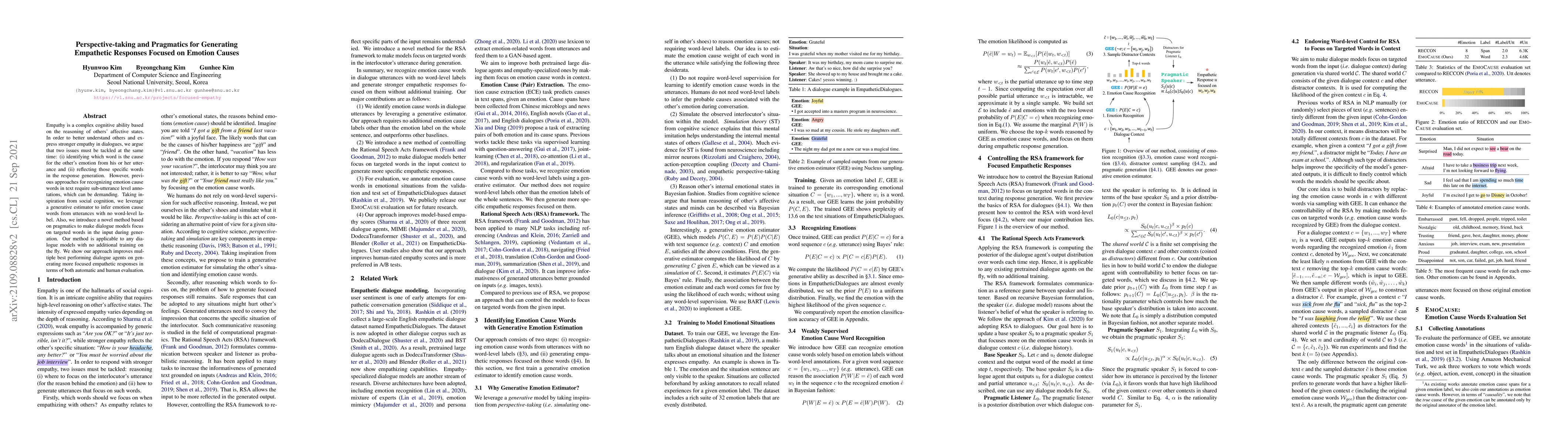 Empathy is a complex cognitive ability based on the reasoning of others' affective states. In order to better understand others and express stronger empathy in dialogues, we argue that two issues must be tackled at the same time: (i) identifying which word is the cause for the other's emotion from his or her utterance and (ii) reflecting those specific words in the response generation. However, previous approaches for recognizing emotion cause words in text require sub-utterance level annotations, which can be demanding. Taking inspiration from social cognition, we leverage a generative estimator to infer emotion cause words from utterances with no word-level label. Also, we introduce a novel method based on pragmatics to make dialogue models focus on targeted words in the input during generation. Our method is applicable to any dialogue models with no additional training on the fly. We show our approach improves multiple best-performing dialogue agents on generating more focused empathetic responses in terms of both automatic and human evaluation.