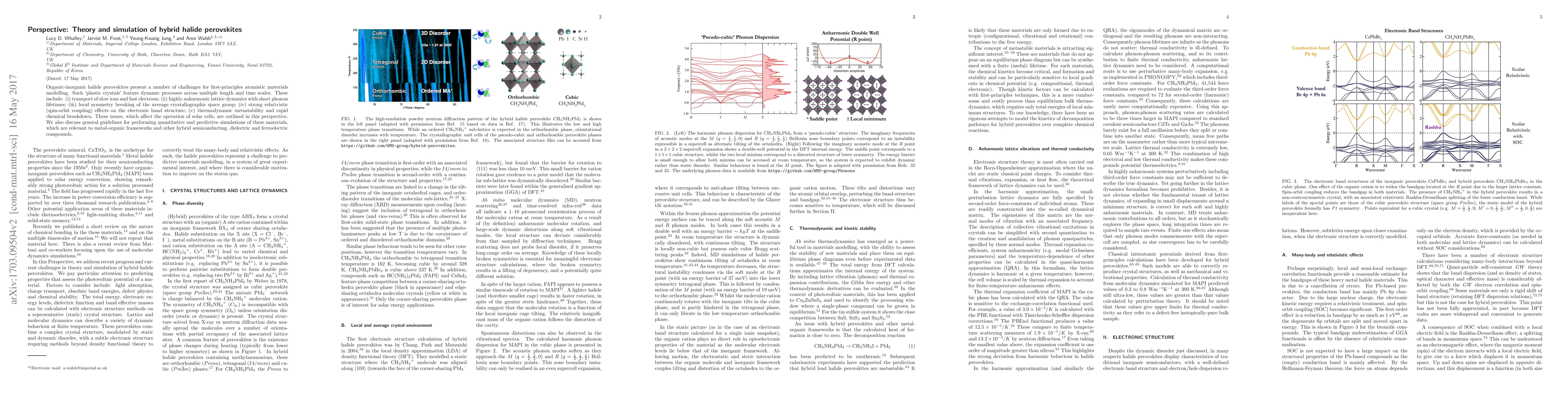 Organic-inorganic halide perovskites present a number of challenges for first-principles atomistic materials modelling. These `plastic crystals' feature dynamic processes across multiple length-scales and time-scales, which include: (i) transport of slow ions and fast electrons; (ii) highly anharmonic lattice dynamics with short phonon lifetimes; (iii) local symmetry breaking of the average crystallographic space group; (iv) strong relativistic (spin-orbit coupling) effects on the electronic band structure; (v) thermodynamic metastability and rapid chemical breakdown. These issues, which affect the operation of solar cells, are outlined in this perspective. We also discuss general guidelines for performing quantitative and predictive simulations of these materials, which are relevant to metal-organic frameworks and other hybrid semiconducting, dielectric and ferroelectric compounds.