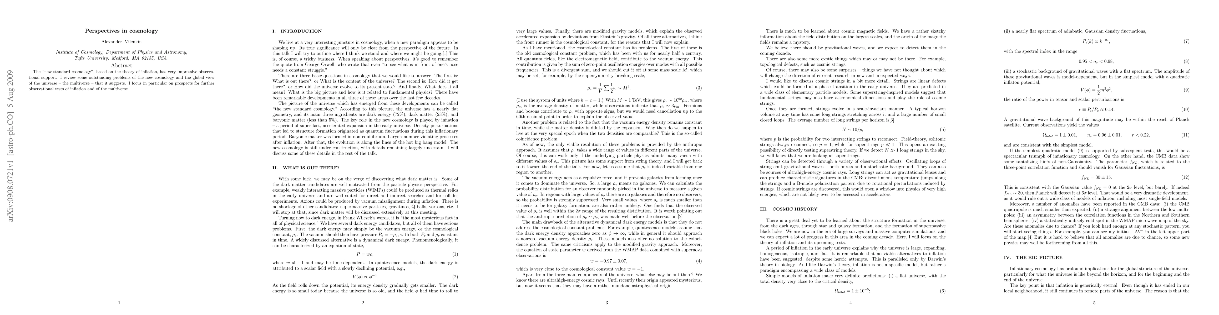 The "new standard cosmology", based on the theory of inflation, has very impressive observational support. I review some outstanding problems of the new cosmology and the global view of the universe -- the multiverse -- that it suggests. I focus in particular on prospects for further observational tests of inflation and of the multiverse.
