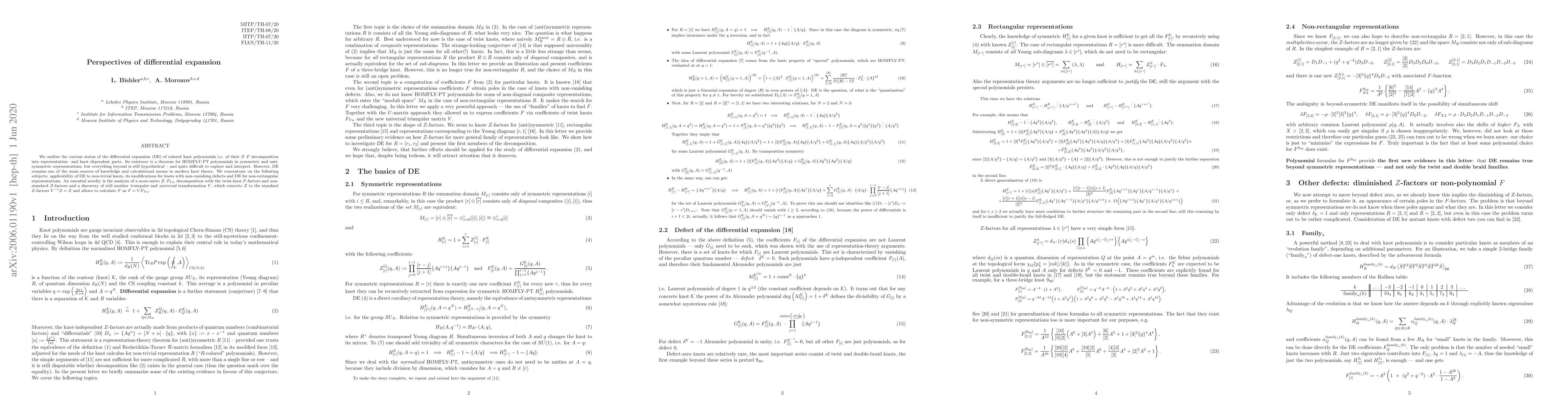 We outline the current status of the differential expansion (DE) of colored knot polynomials i.e. of their $Z$--$F$ decomposition into representation-- and knot--dependent parts. Its existence is a theorem for HOMFLY-PT polynomials in symmetric and antisymmetric representations, but everything beyond is still hypothetical -- and quite difficult to explore and interpret. However, DE remains one of the main sources of knowledge and calculational means in modern knot theory. We concentrate on the following subjects: applicability of DE to non-trivial knots, its modifications for knots with non-vanishing defects and DE for non-rectangular representations. An essential novelty is the analysis of a more-naive ${\cal Z}$--${F_{Tw}}$ decomposition with the twist-knot $F$-factors and non-standard ${\cal Z}$-factors and a discovery of still another triangular and universal transformation $V$, which converts $\cal{Z}$ to the standard $Z$-factors $V^{-1}\cdot {\cal Z}= Z$ and allows to calculate $F$ as $F = V\cdot F_{Tw}$.