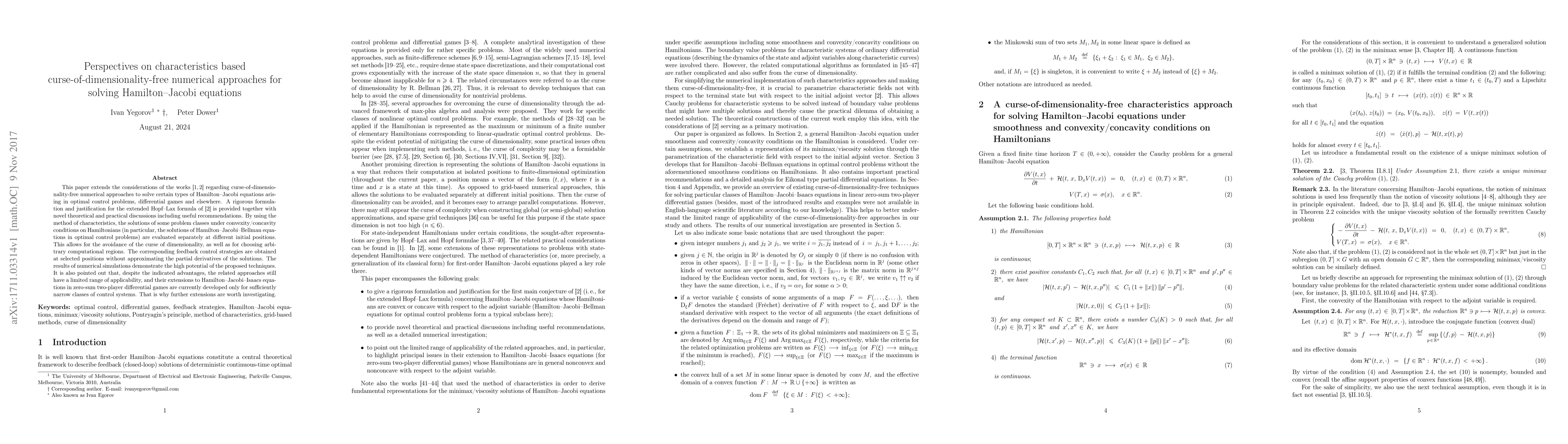 This paper extends the considerations of the works [1, 2] regarding curse-of-dimensionality-free numerical approaches to solve certain types of Hamilton-Jacobi equations arising in optimal control problems, differential games and elsewhere. A rigorous formulation and justification for the extended Hopf-Lax formula of [2] is provided together with novel theoretical and practical discussions including useful recommendations. By using the method of characteristics, the solutions of some problem classes under convexity/concavity conditions on Hamiltonians (in particular, the solutions of Hamilton-Jacobi-Bellman equations in optimal control problems) are evaluated separately at different initial positions. This allows for the avoidance of the curse of dimensionality, as well as for choosing arbitrary computational regions. The corresponding feedback control strategies are obtained at selected positions without approximating the partial derivatives of the solutions. The results of numerical simulations demonstrate the high potential of the proposed techniques. It is also pointed out that, despite the indicated advantages, the related approaches still have a limited range of applicability, and their extensions to Hamilton-Jacobi-Isaacs equations in zero-sum two-player differential games are currently developed only for sufficiently narrow classes of control systems. That is why further extensions are worth investigating.